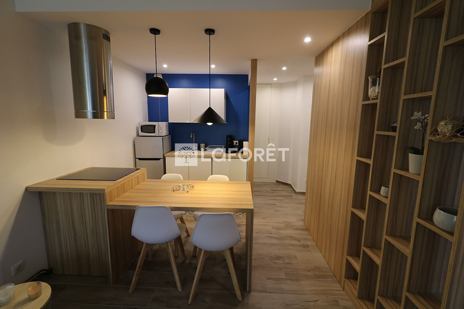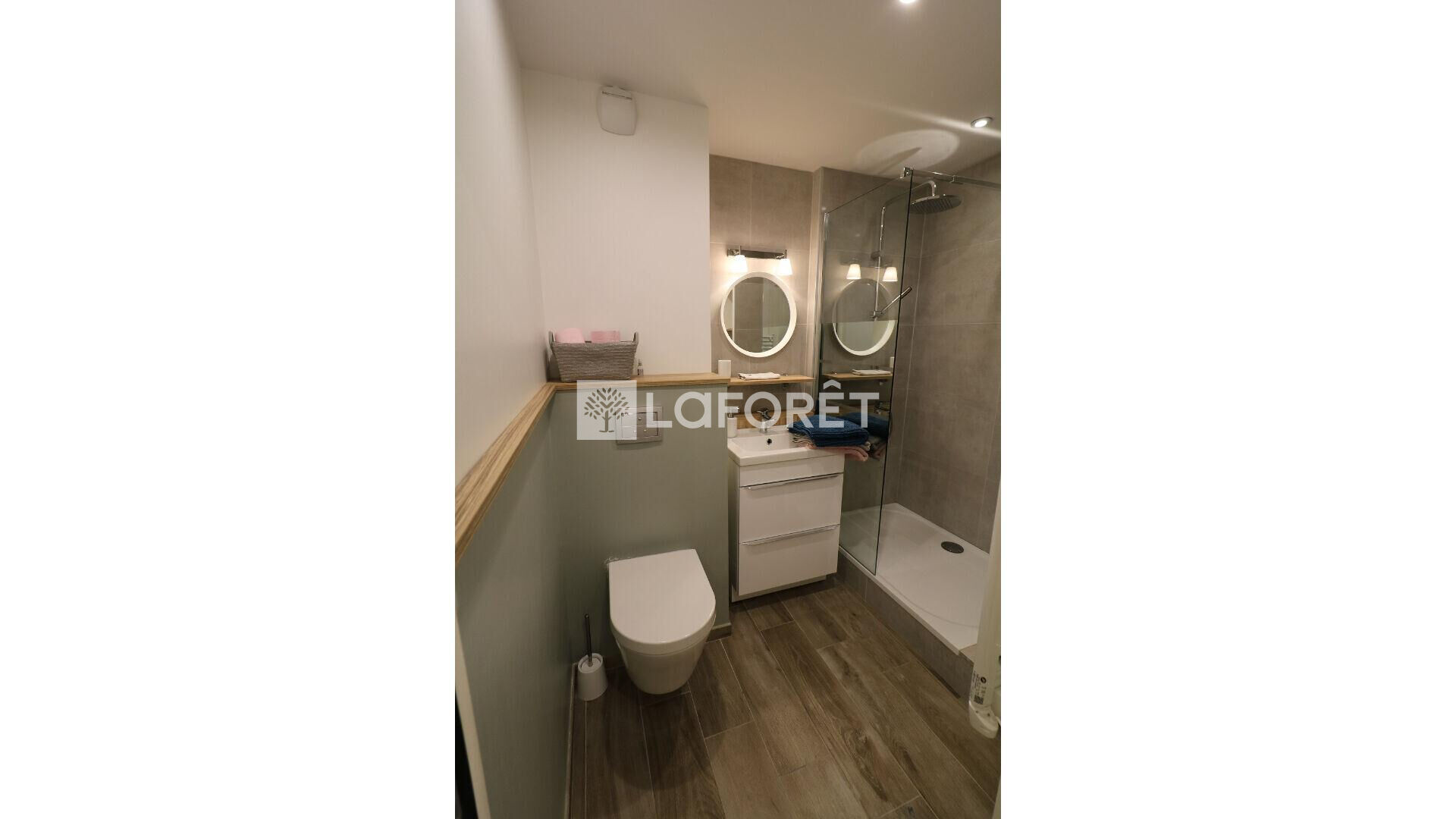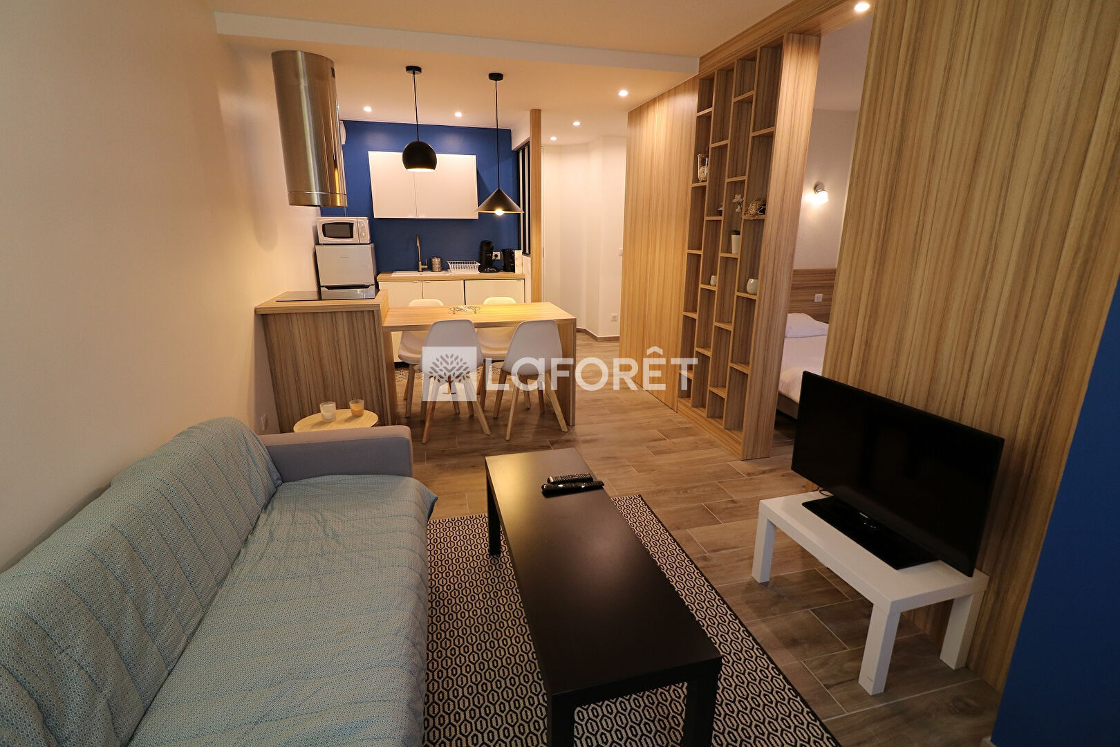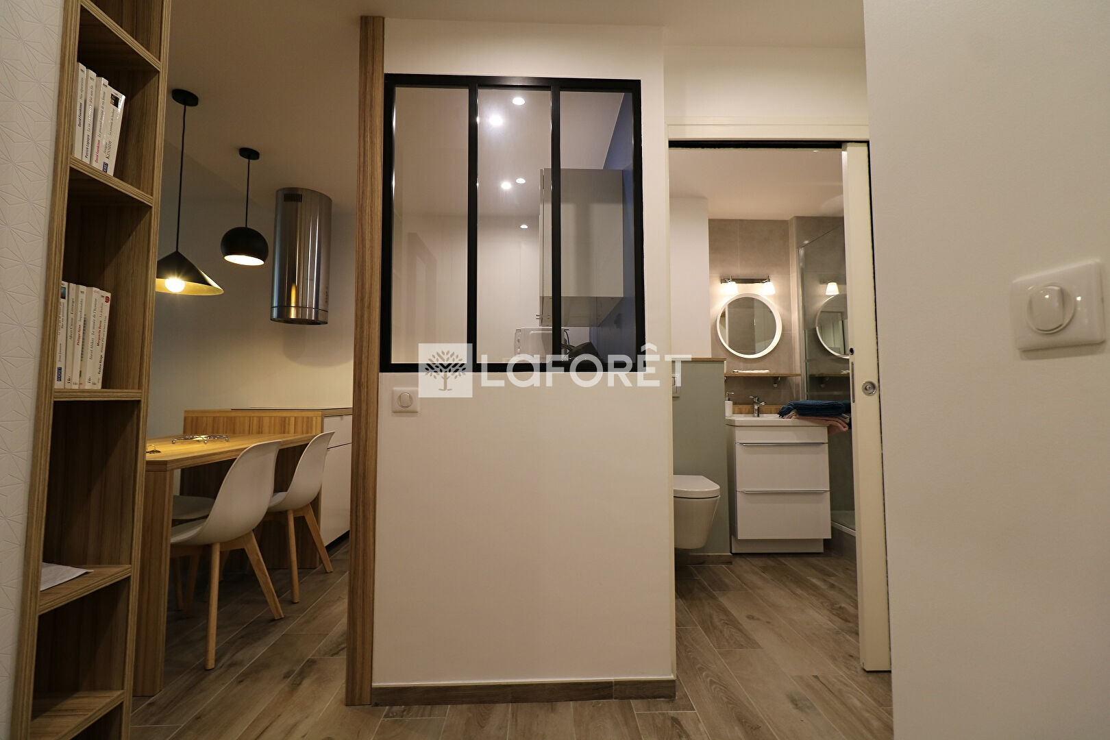 L'appartement bénéficie d'un agencement optimisé avec un coin nuit distinct, une pièce de vie lumineuse avec cuisine ouverte entièrement équipée (plaque, hotte, four, frigo), ainsi qu'une salle d'eau moderne avec grande douche et WC suspendu.