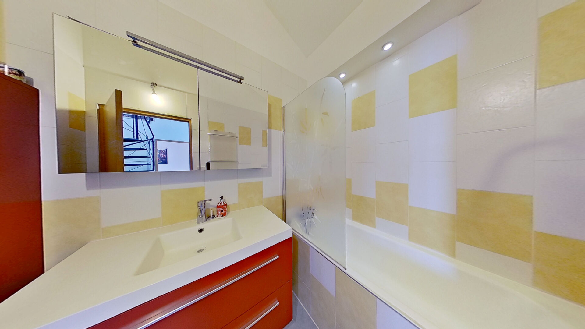 La maison dispose de trois chambres, dont une suite parentale avec salle d'eau et toilettes, ainsi qu'un bureau de 7 m² adapté au télétravail ou à un usage d'appoint. Une salle de bain indépendante et des toilettes séparées complètent ce niveau.