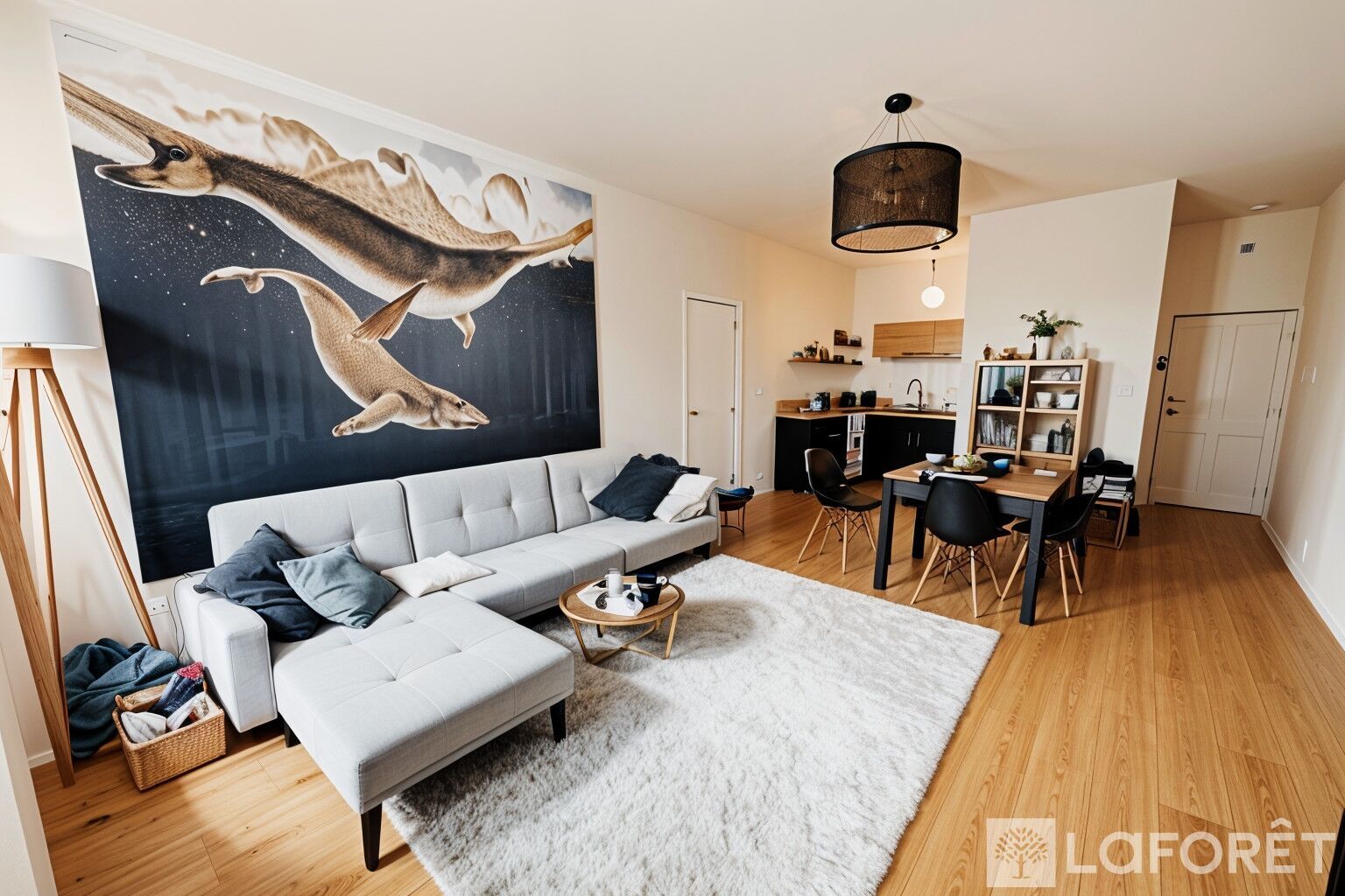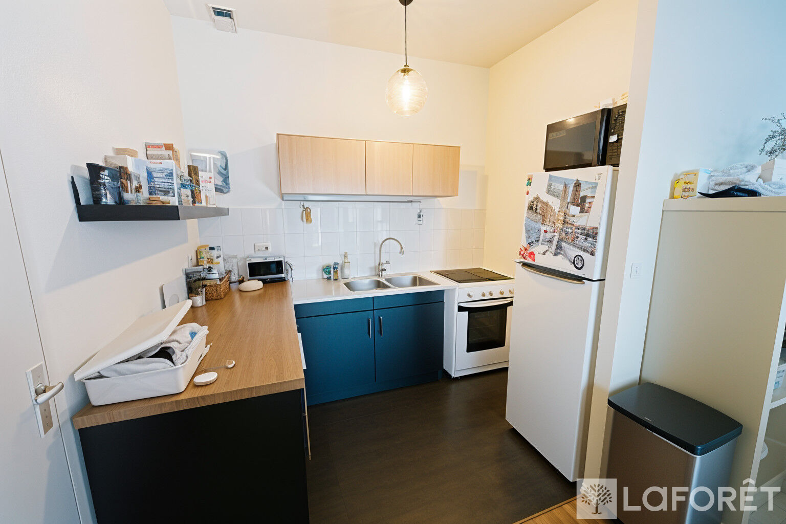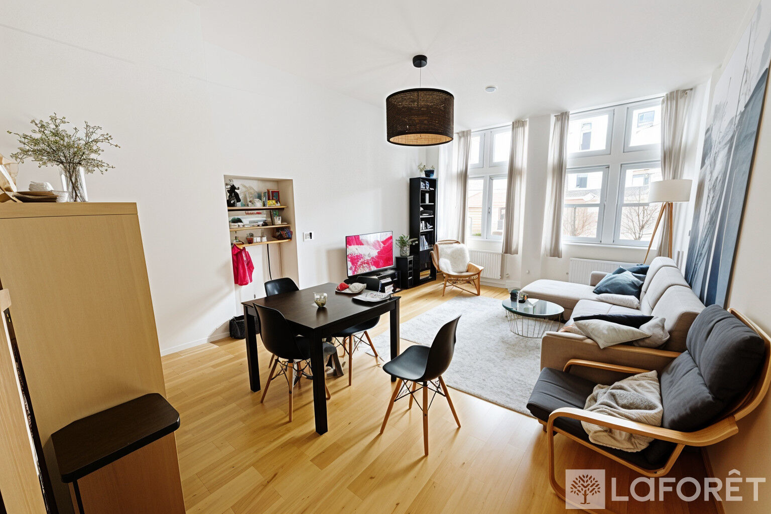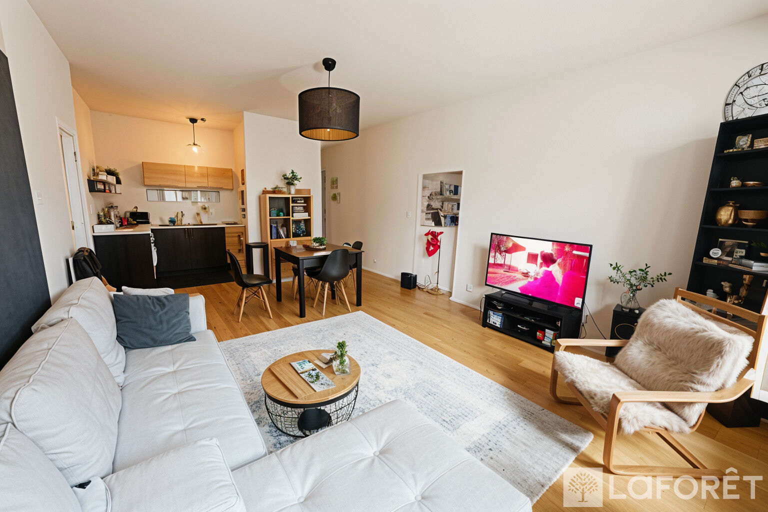 L'appartement s'ouvre sur une entrée desservant une agréable pièce de vie lumineuse, dotée de deux doubles fenêtres et bénéficiant d'une exposition sud-est . La cuisine ouverte s'intègre parfaitement à cet espace, offrant un cadre convivial et fonctionnel.