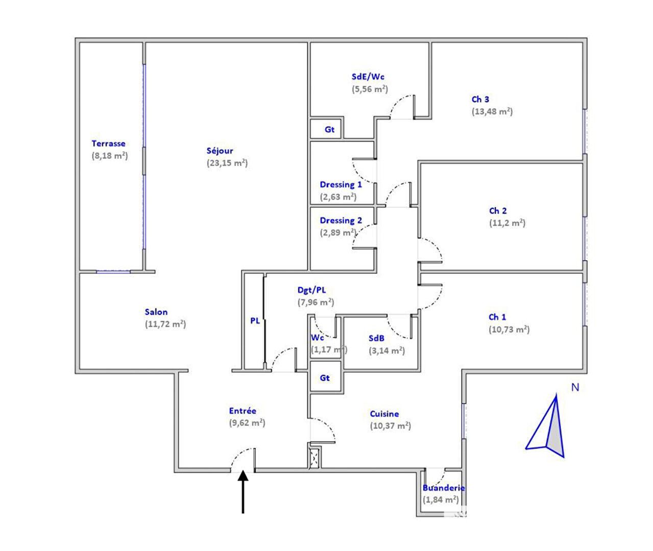 Une vaste entrée, une cuisine moderne indépendante avec cellier, un salon séjour sur un balcon de 8 m² environ, trois chambres confortables, deux espaces dressing aménagés, deux salles de bains.