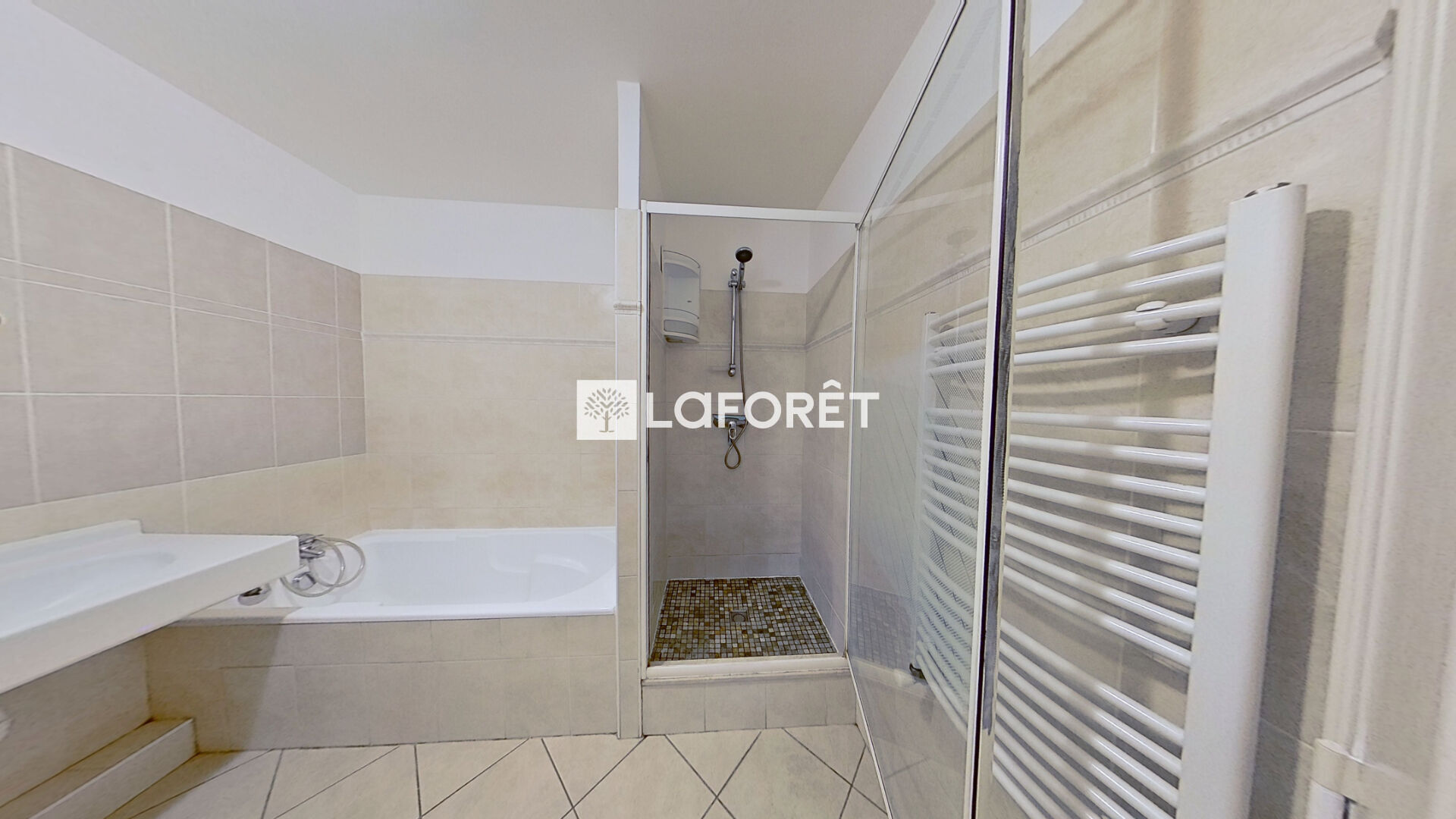 Une salle de bains rare, équipée à la fois d'une baignoire et d'une douche,