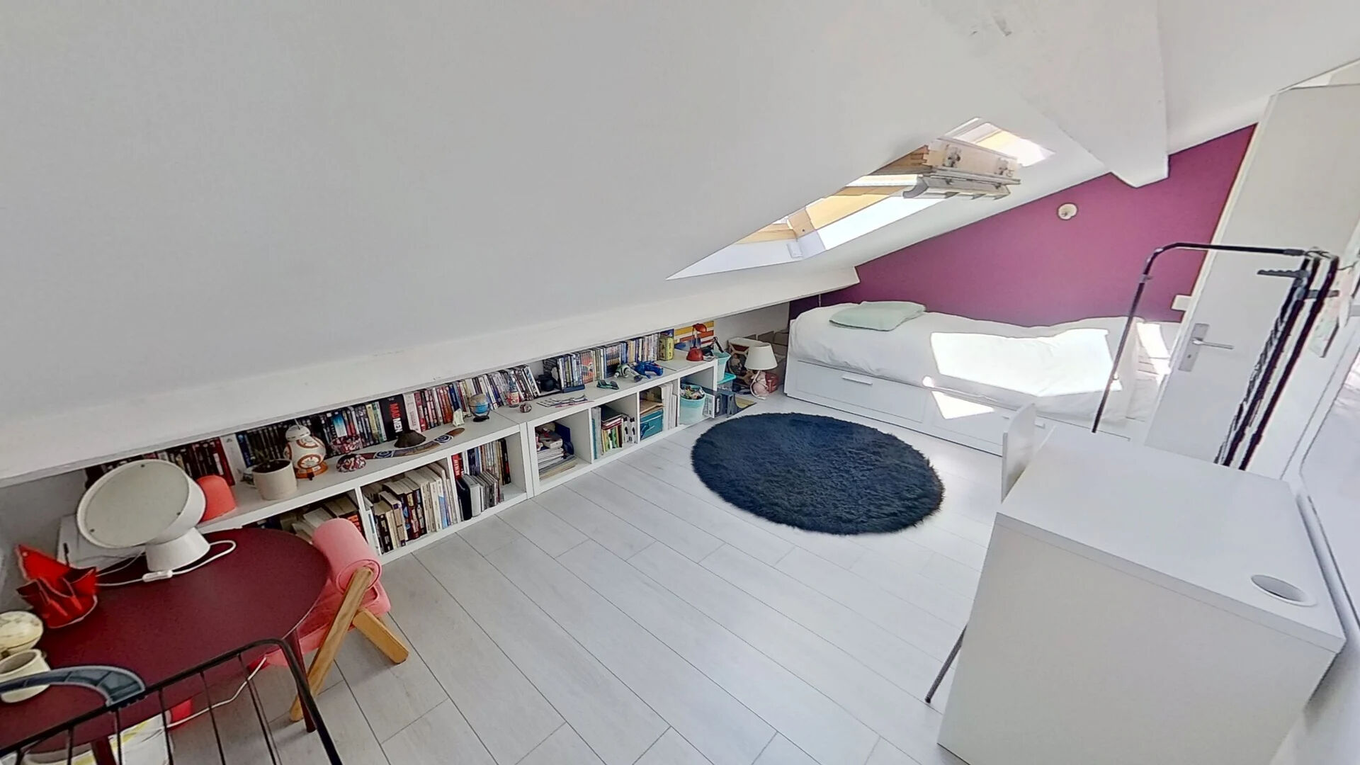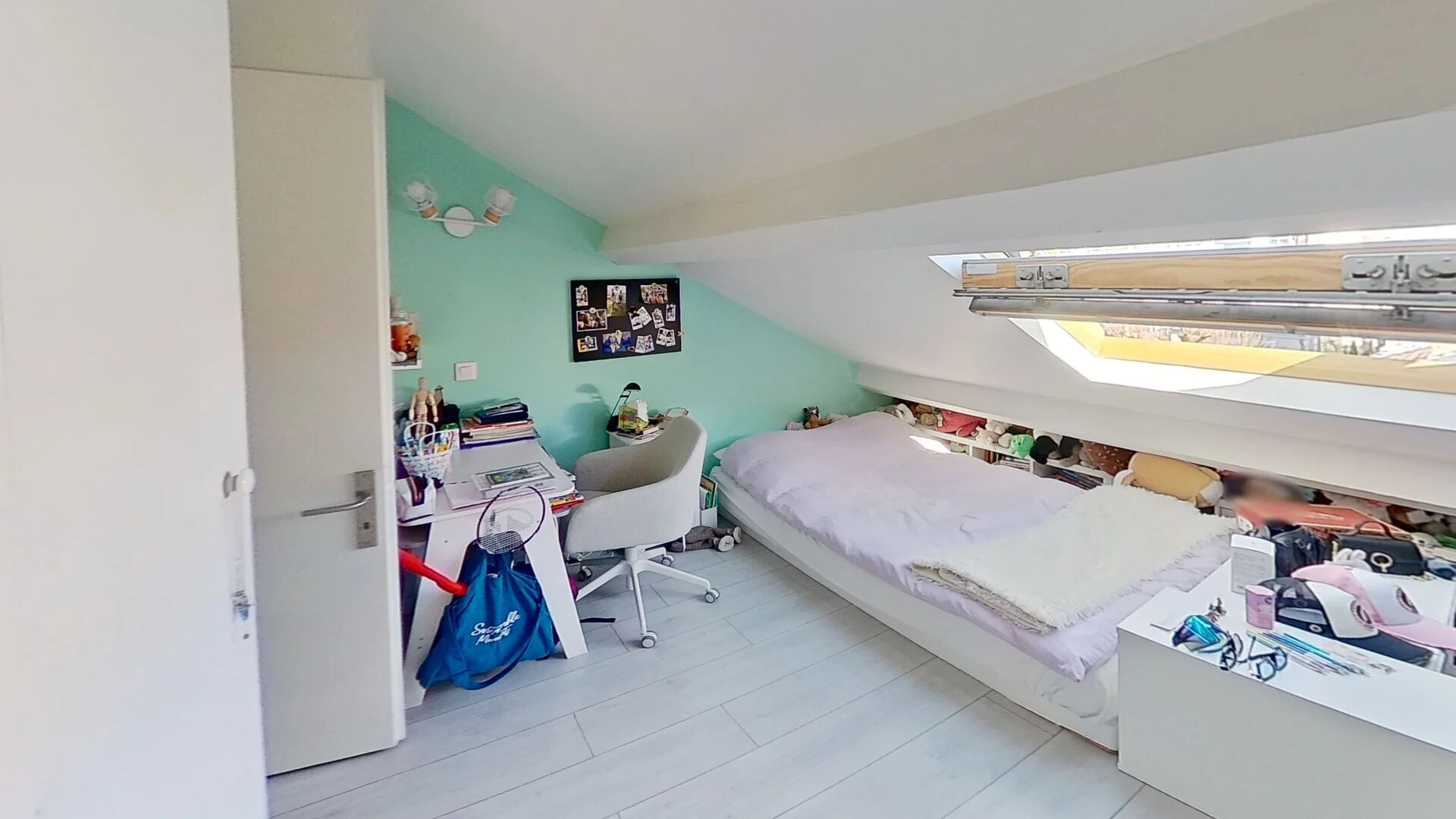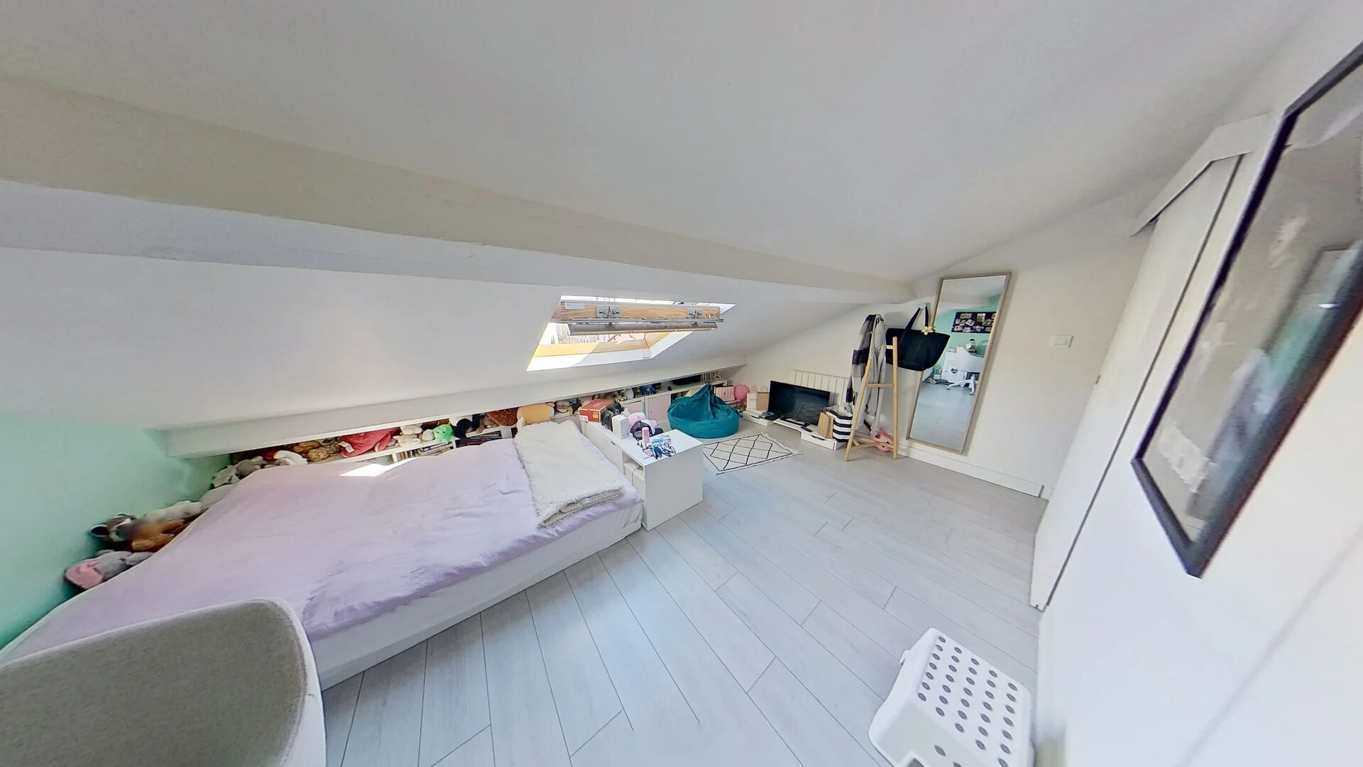 Sous les combles, deux chambres éclairées par deux vélux, ainsi qu'un WC avec un grand lavabo.