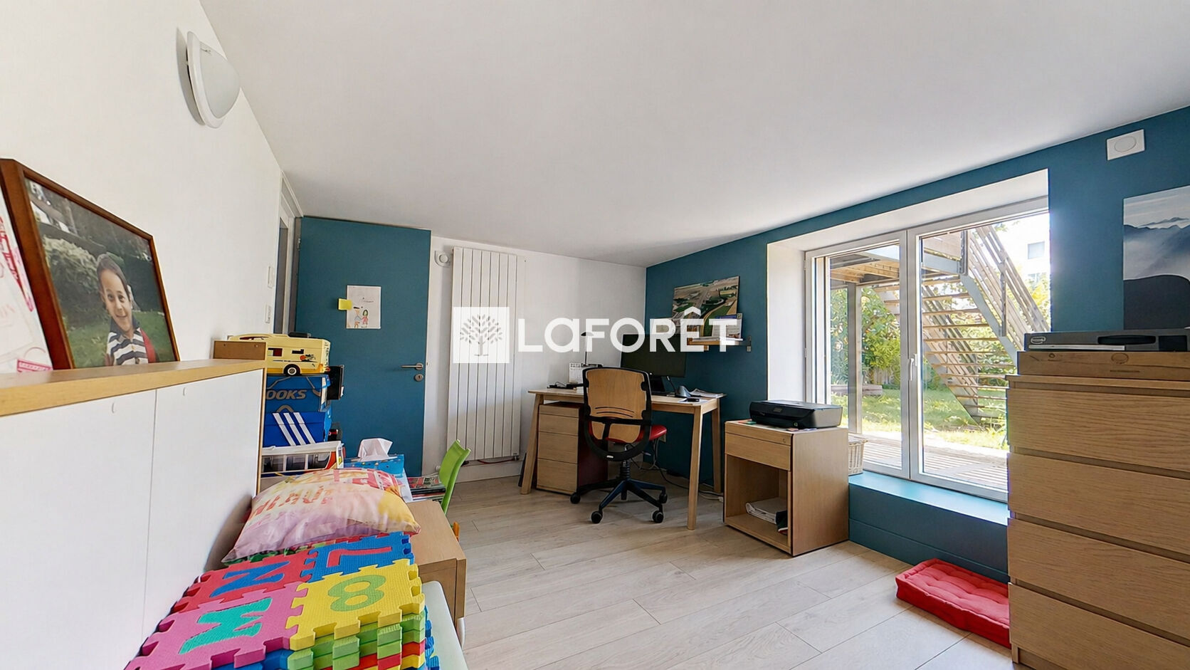 Au niveau principal, le séjour ouvert sur la cuisine forme un espace de vie chaleureux et lumineux, prolongé par une grande terrasse bois côté jardin. Une chambre ou bureau complète ce niveau.