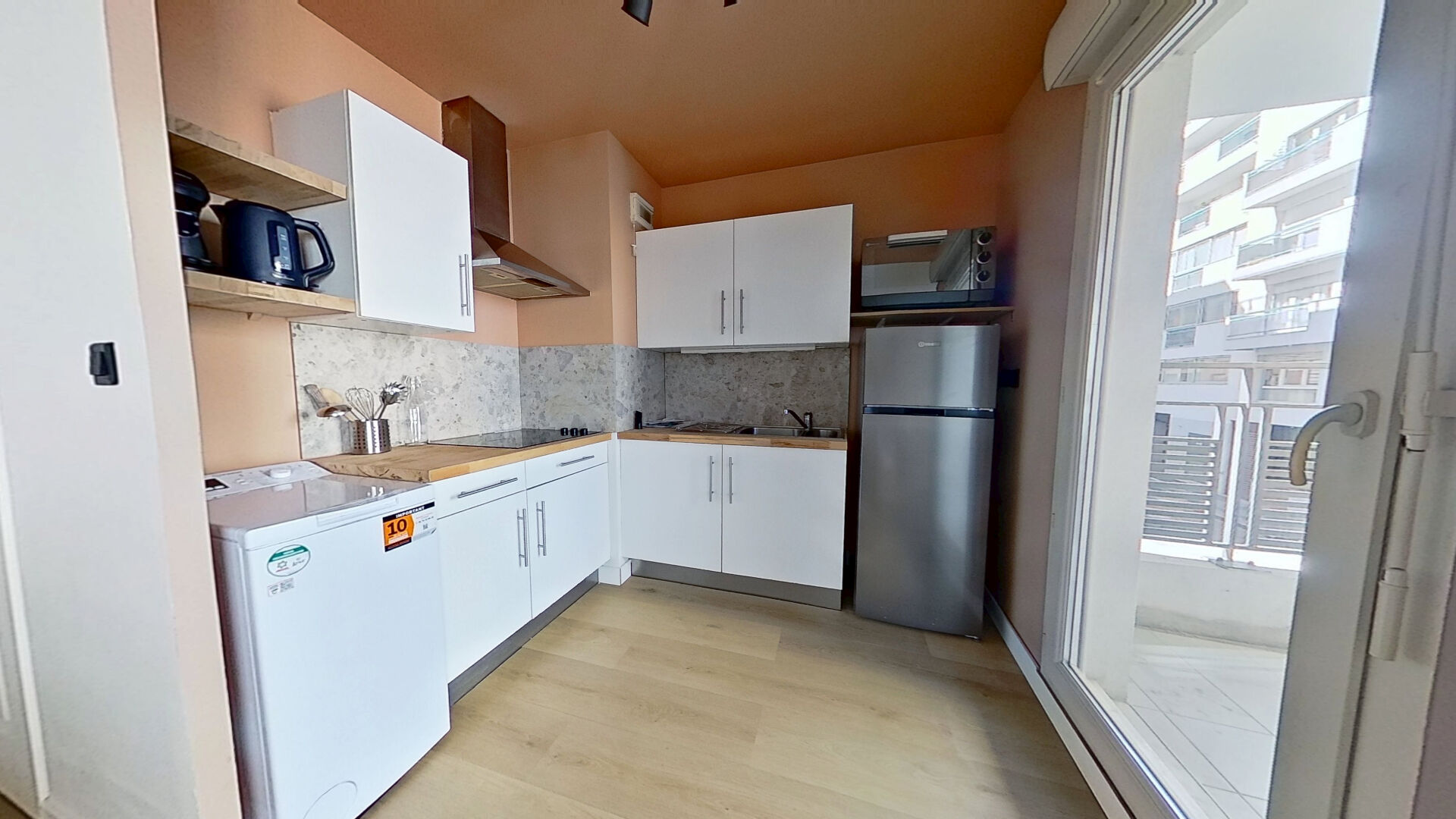 séjour lumineux avec cuisine ouverte, chambre séparée, salle de bains et WC indépendants