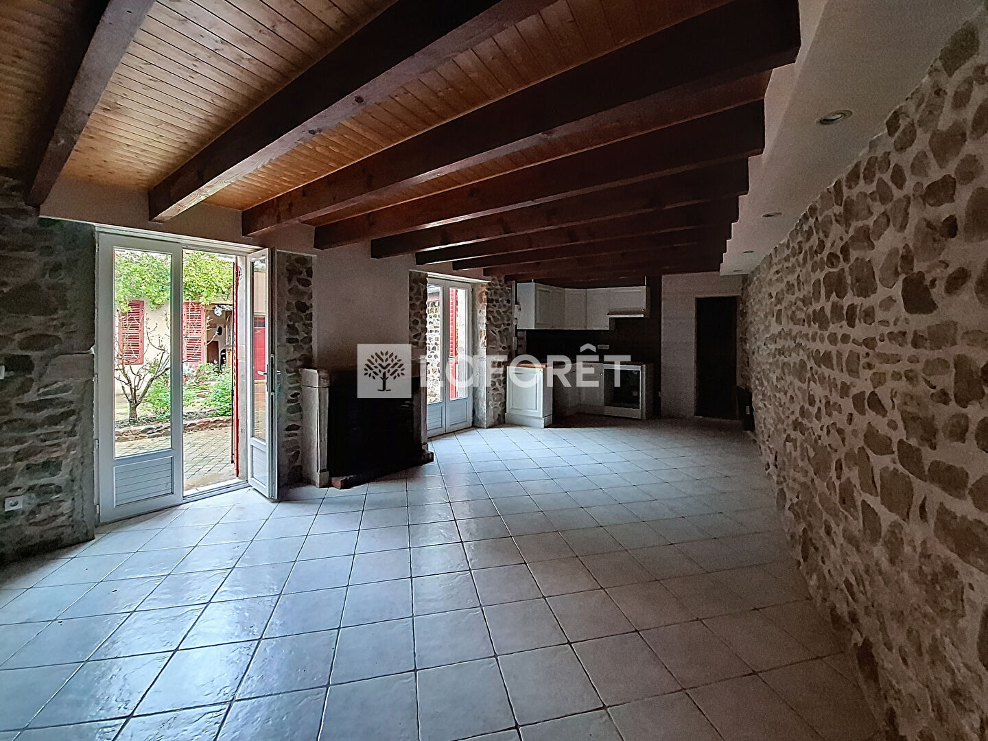 D'une surface d'environ 67 m², répartie sur deux niveaux, elle propose au rez-de-chaussée une belle pièce de vie chaleureuse, sublimée par ses poutres apparentes et ses murs en pierre. Une salle de bain avec WC complète ce niveau.