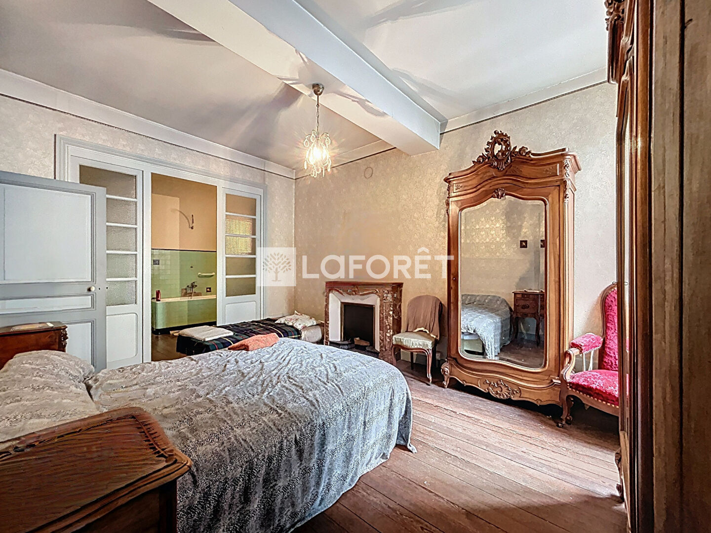 À l'étage, deux espaces bien distincts : D'un côté, une première partie composée d'une chambre, d'un dressing, d'une seconde chambre en enfilade et d'une pièce donnant accès à un premier grenier d'environ 50 à 60 m², entièrement aménageable.