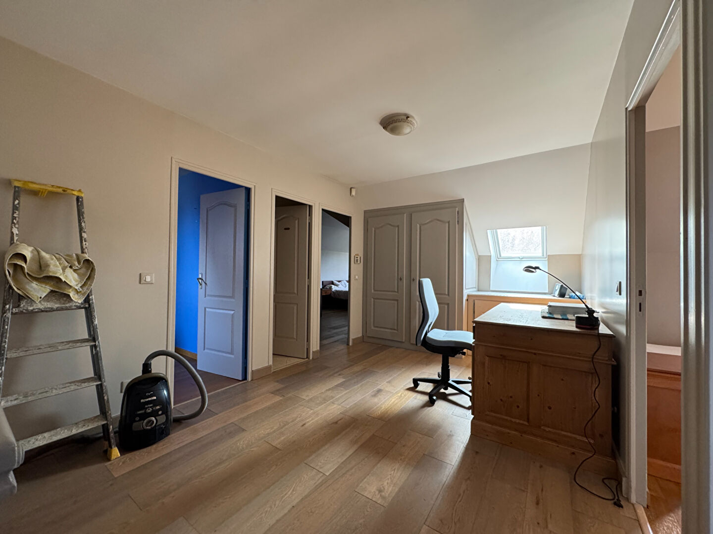 A l'étage : grand palier, 3 chambres dont une de 26 m², salle de bain