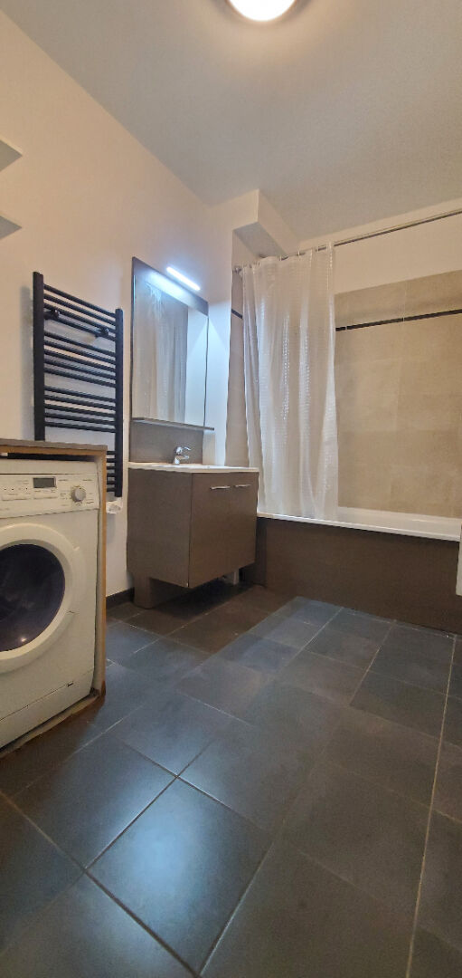 Salle de bains avec lave-linge et sèche serviettes. wc séparés.