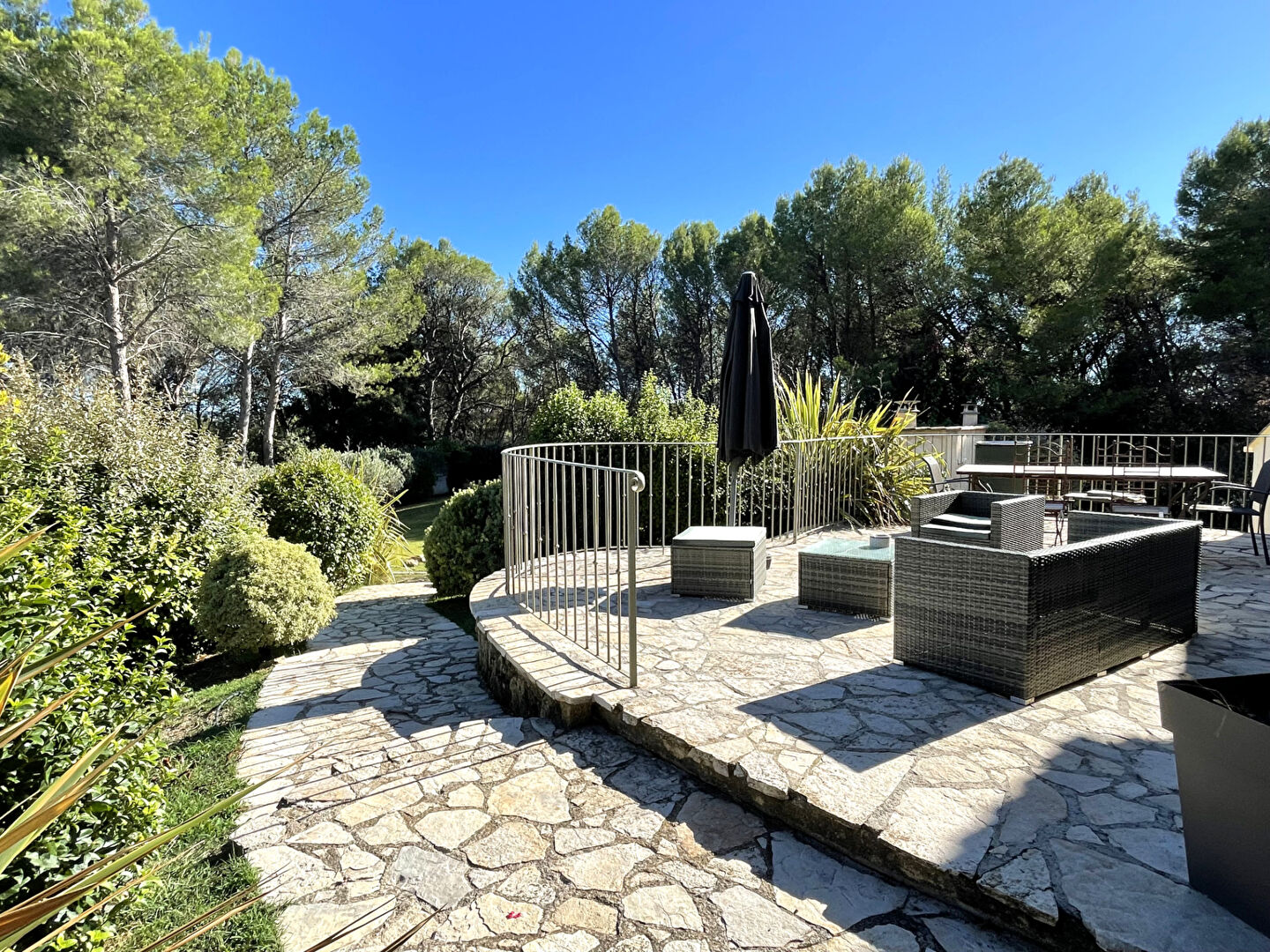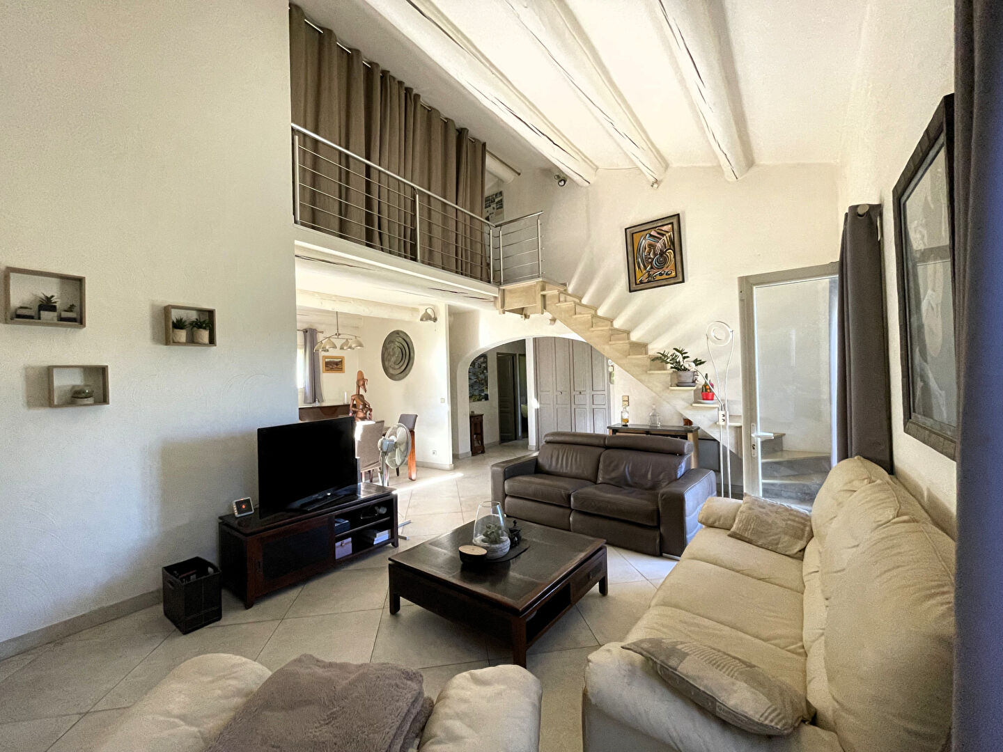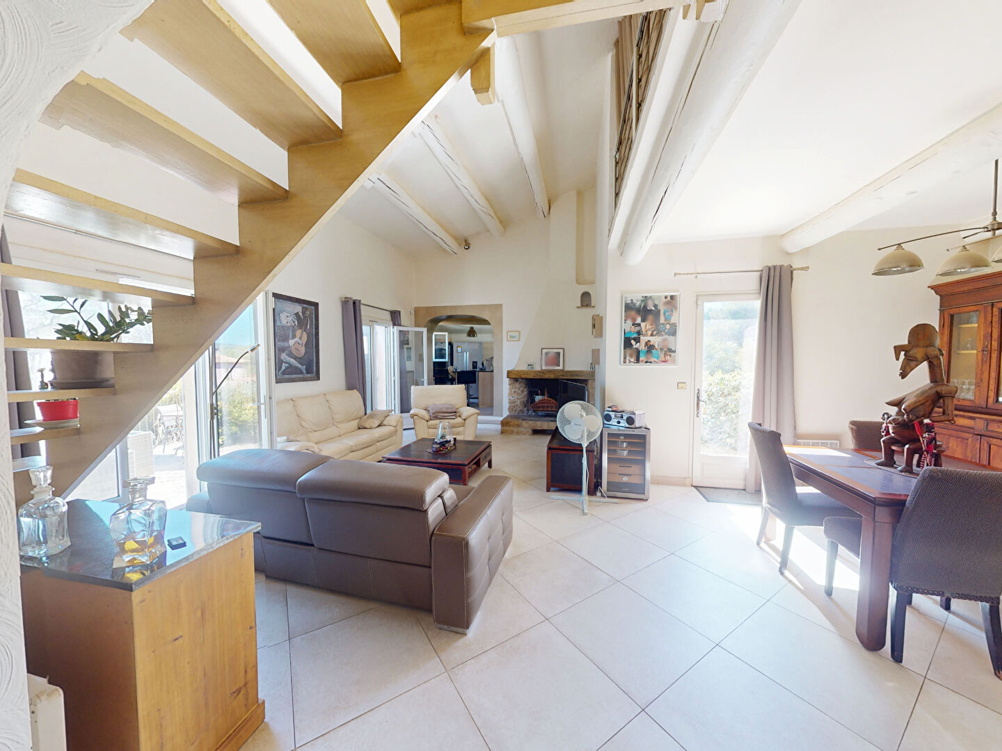 Le salon s'ouvre sur la terrasse, créant un espace de vie conviviale à l'intérieur comme à l'extérieur.