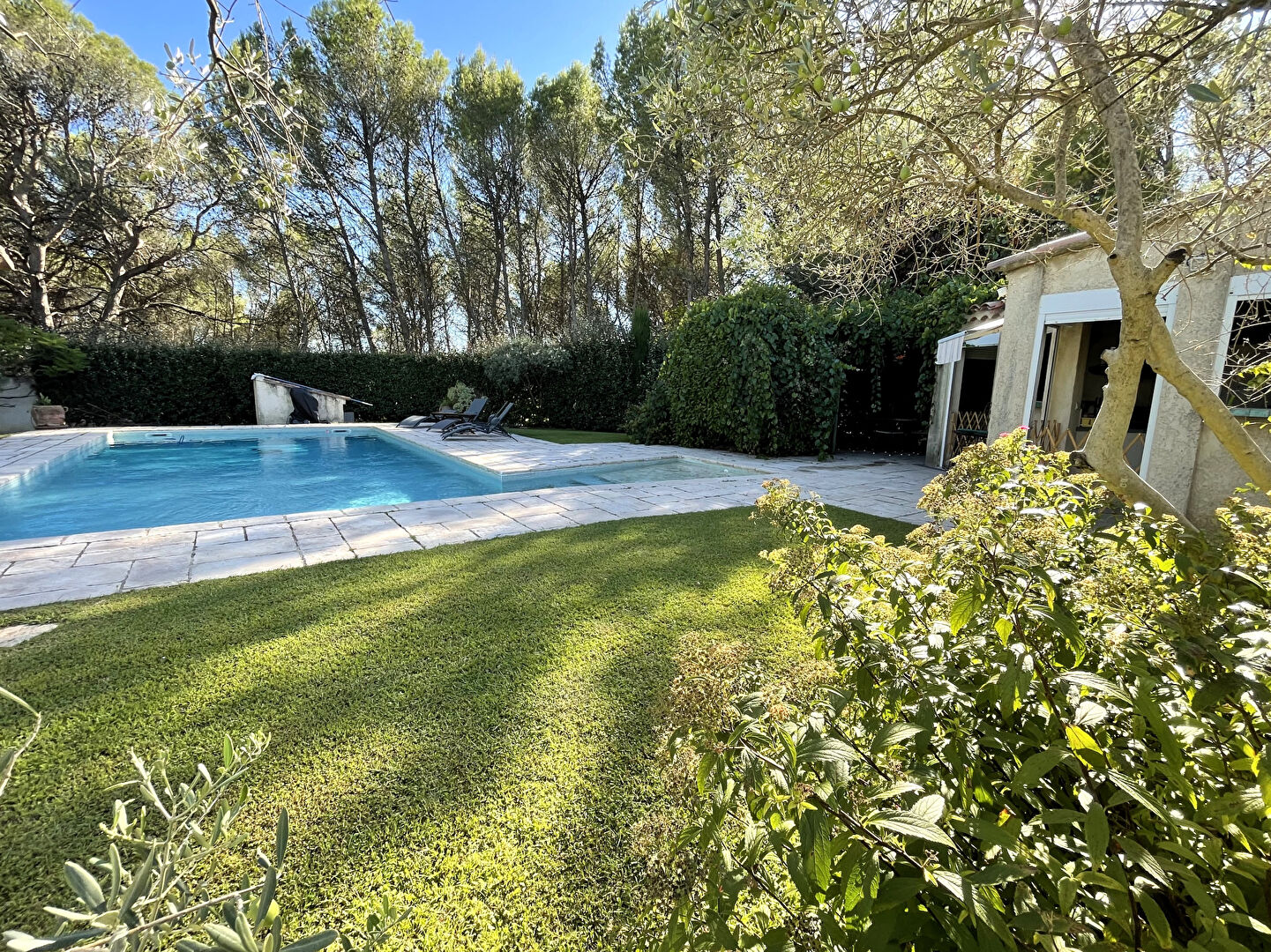 Vous apprécierez la piscine rafraîchissante, le garage pratique ainsi qu'une terrasse qui offre une vue apaisante, idéale pour des moments agréables en famille ou entre amis.