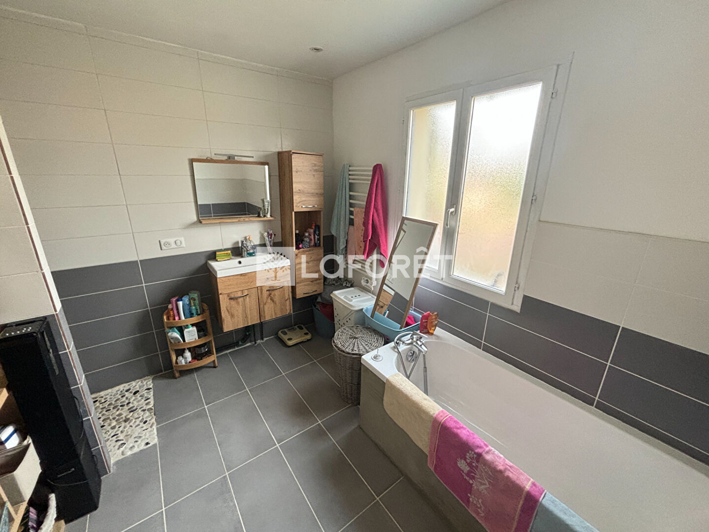 Entrée, séjour double, cuisine ouverte sur pièce de vie et terrasse, salle de bains (baignoire et douche), et toilettes indépendantes,