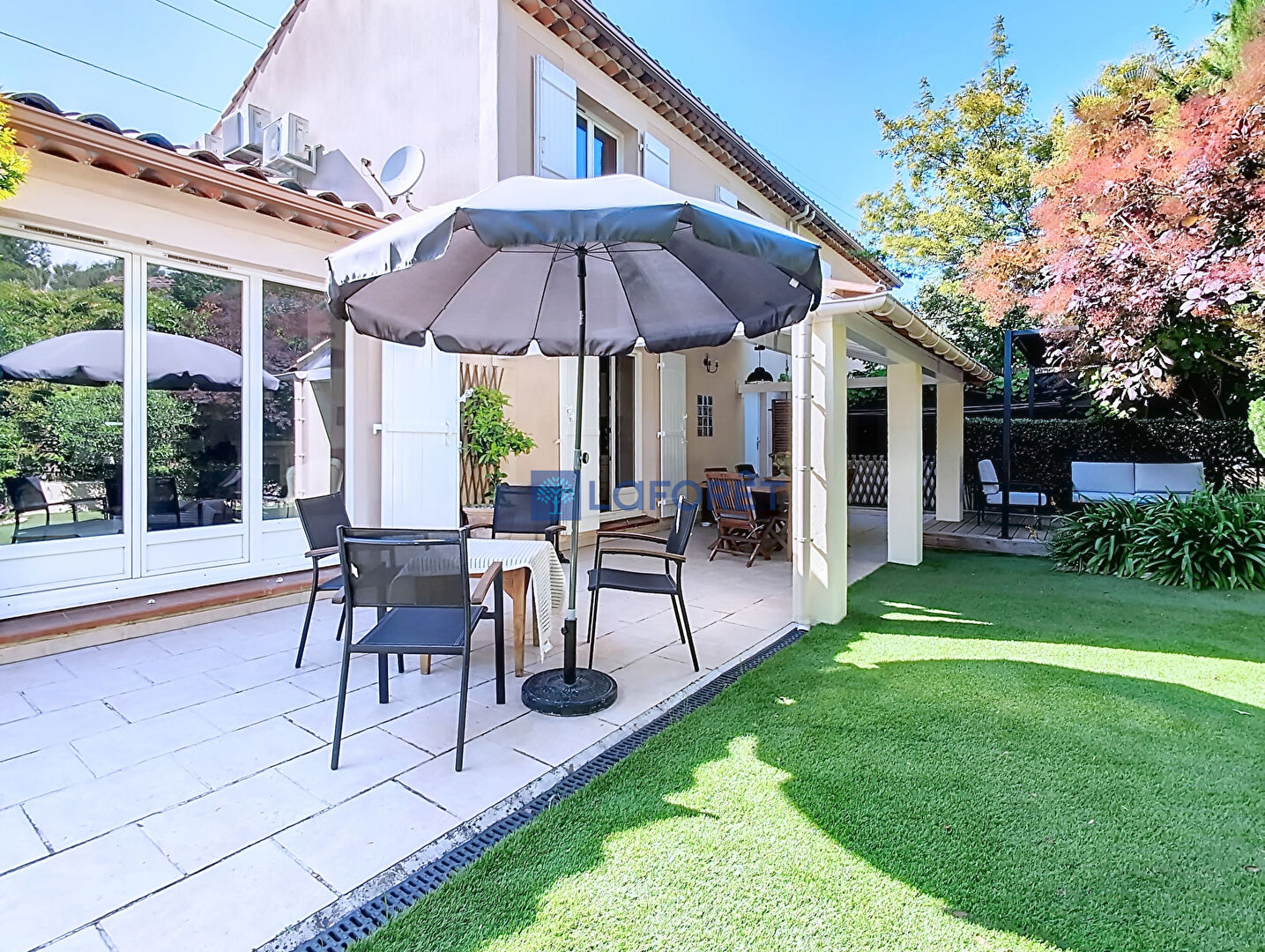 Le terrain est entièrement aménagé pour les loisirs extérieurs. Il comprend une piscine, une terrasse couverte ainsi qu'un salon d'été sous pergola. Les aménagements extérieurs sont complétés par une douche d'été et une cabane de jardin destinée au stockage. L'accès au stationnement est assuré par un garage fermé intégré à la structure principale de la maison.