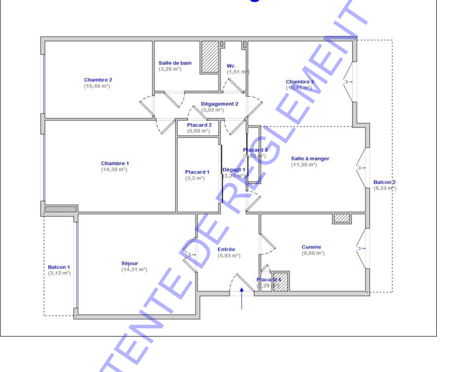 Une entrée, une cuisine indépendante avec accès balcon filant, un salon / salle à manger avec accès balcon filant, trois chambres dont une avec balcon, une salle de bain et un WC séparé.