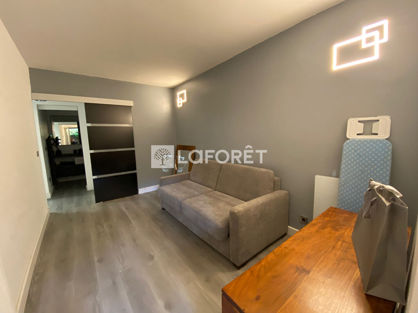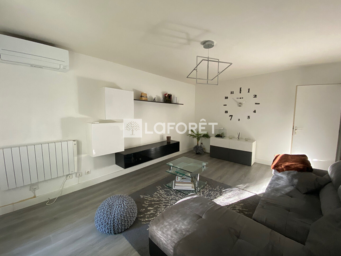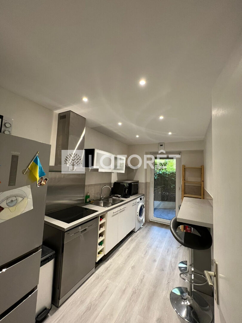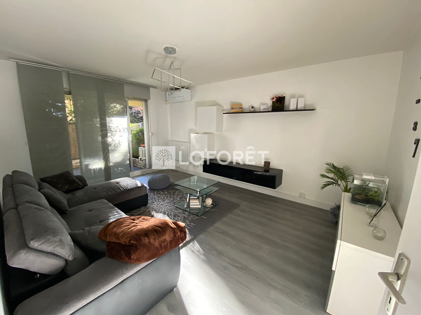 L'appartement comprend une entrée avec placard, une pièce à vivre lumineuse donnant sur une terrasse, une cuisine équipée, une chambre spacieuse, une salle de bains moderne avec douche, et un WC séparé.
