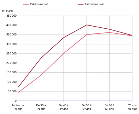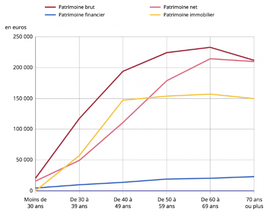 Si l’on regarde le patrimoine dans sa globalité, un ménage dont la personne de référence à moins de 30 ans possède en moyenne 43 000 € de patrimoine net. À 40 ans, on estime que ce patrimoine s’élève à 250 000 €. Il atteint 350 000 € à 60 ans. Il redescend ensuite légèrement.