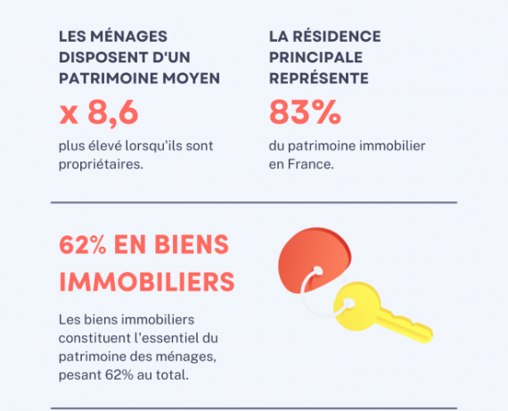La résidence principale est la principale composante du patrimoine immobilier. En effet, 83% du patrimoine immobilier est une résidence principale. En France, six ménages sur dix sont propriétaires de leur résidence principale, qu’ils aient terminé ou non d’en rembourser l’achat.