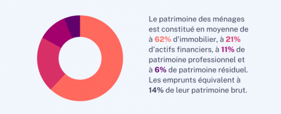 L’immobilier est la première composante du patrimoine des ménages. Il reste une valeur refuge et être propriétaire est un objectif pour de nombreux français. En effet, 62% du patrimoine des français sont des biens immobiliers, 21% sont des actifs financiers, 11% est du patrimoine professionnel et 6% de patrimoine résiduel. Et les emprunts équivalent à 14% de leur patrimoine brut.