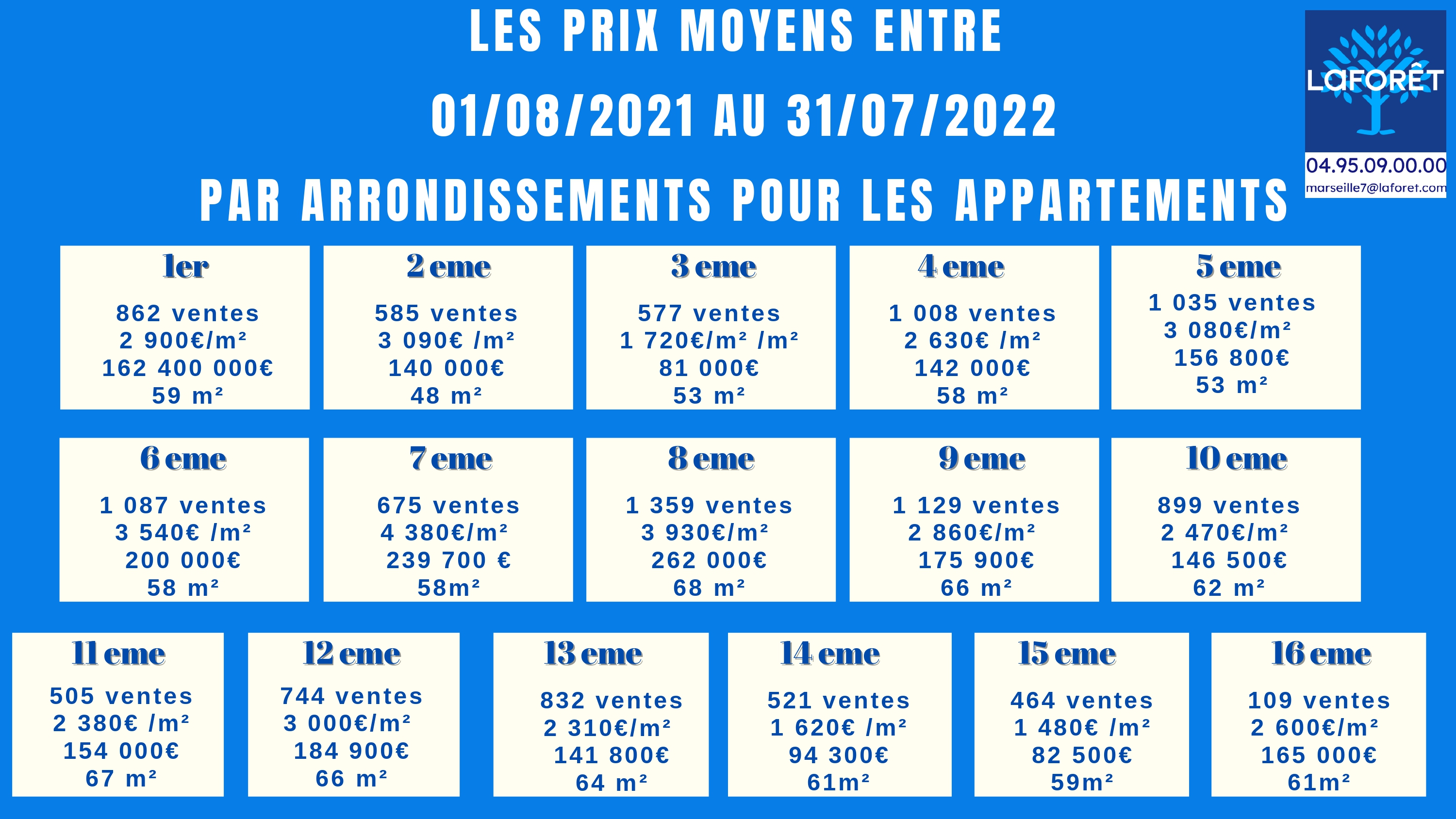 L’année 2022 va enregistrer plus d’un million de vente dans l’ancien dans toute la France. Sur Marseille sur la période du 1er Aout 2021 au 31 Juillet 2022, nous avons enregistré au total 14 218 ventes dans l’ancien (Appartements et maisons). Données notaires. Dans cet article je vais vous exposer le nombre de ventes qui a eu lieu du 1er Aout 2021 au 31 Juillet 2022 dans chaque arrondissement de Marseille. Ci-dessous un tableau regroupant les arrondissements de Marseille avec le prix moyen au m², la surface moyenne et le prix médian acté. (Appartements et maisons séparés).