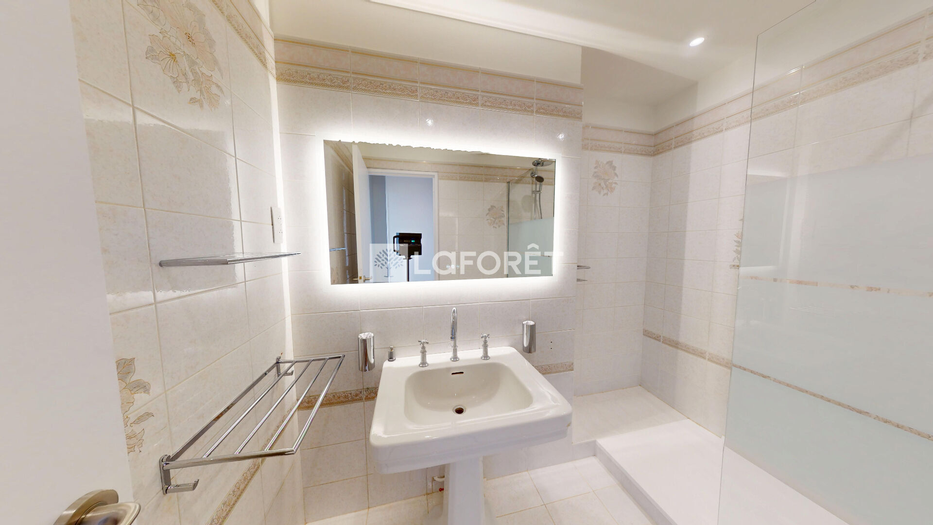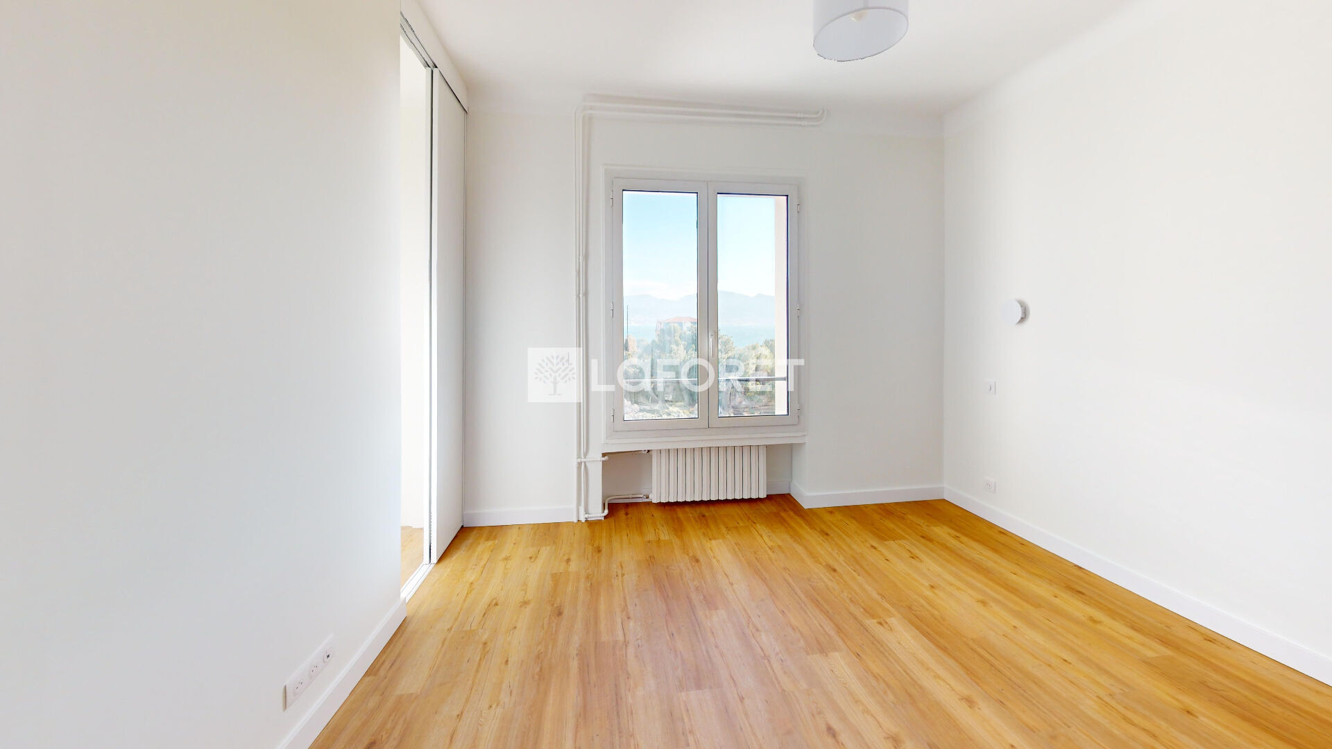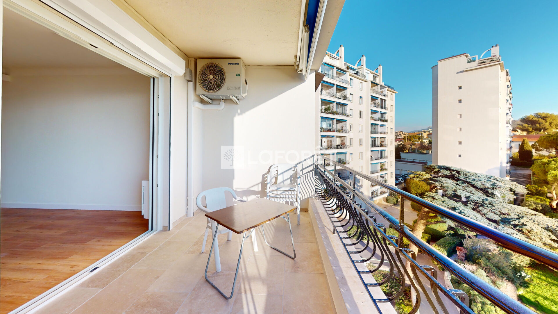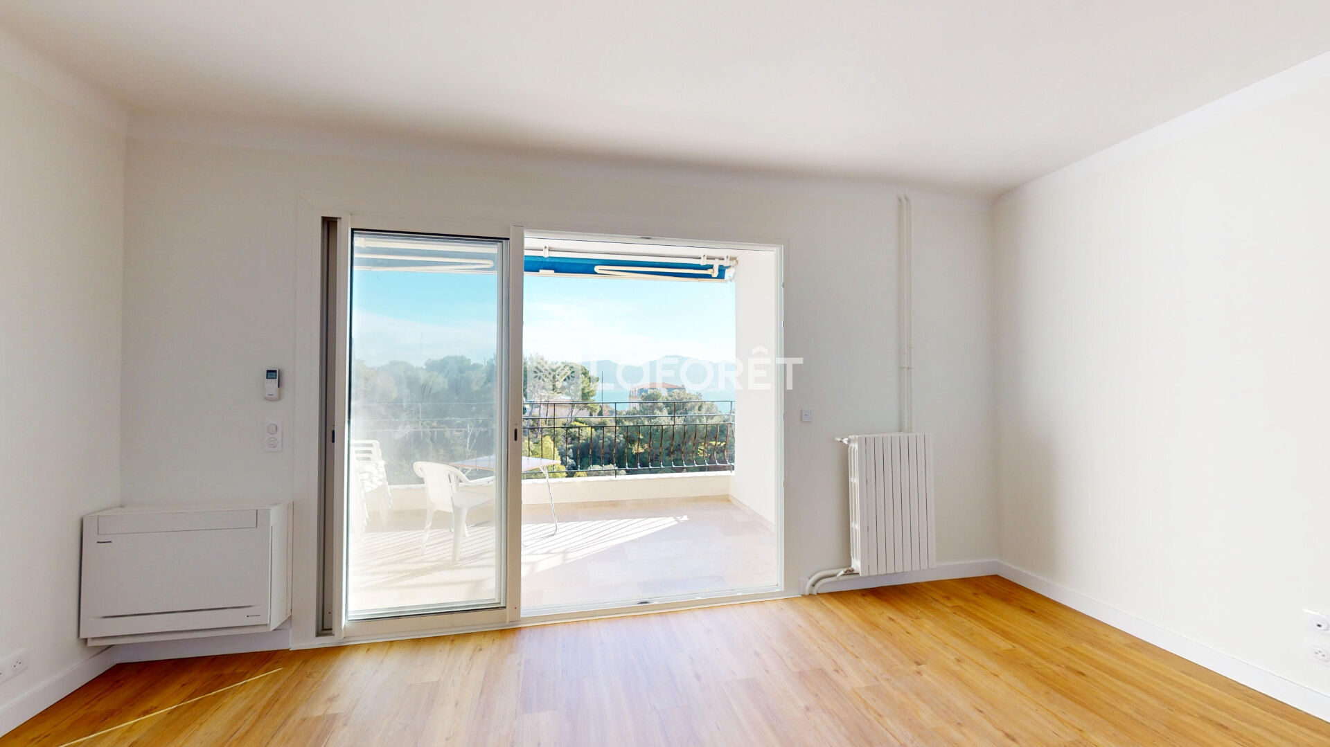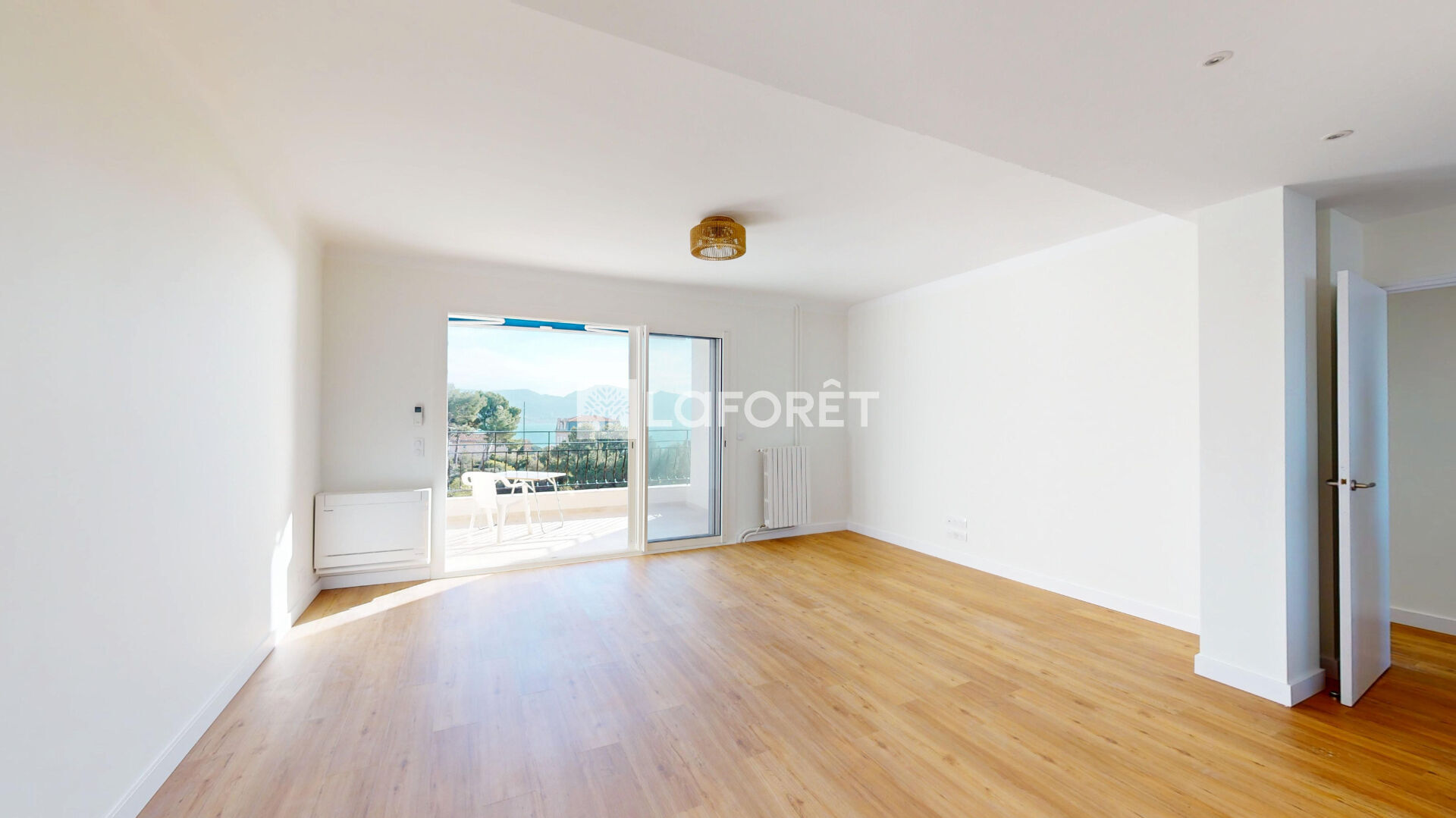 Un séjour baigné de lumière s'ouvre sur une terrasse d'environ 10 m², avec vue dégagée sur la mer et le Parc Valmer. Oui, ça existe. Et oui, c'est aussi agréable en vrai qu'en photo.