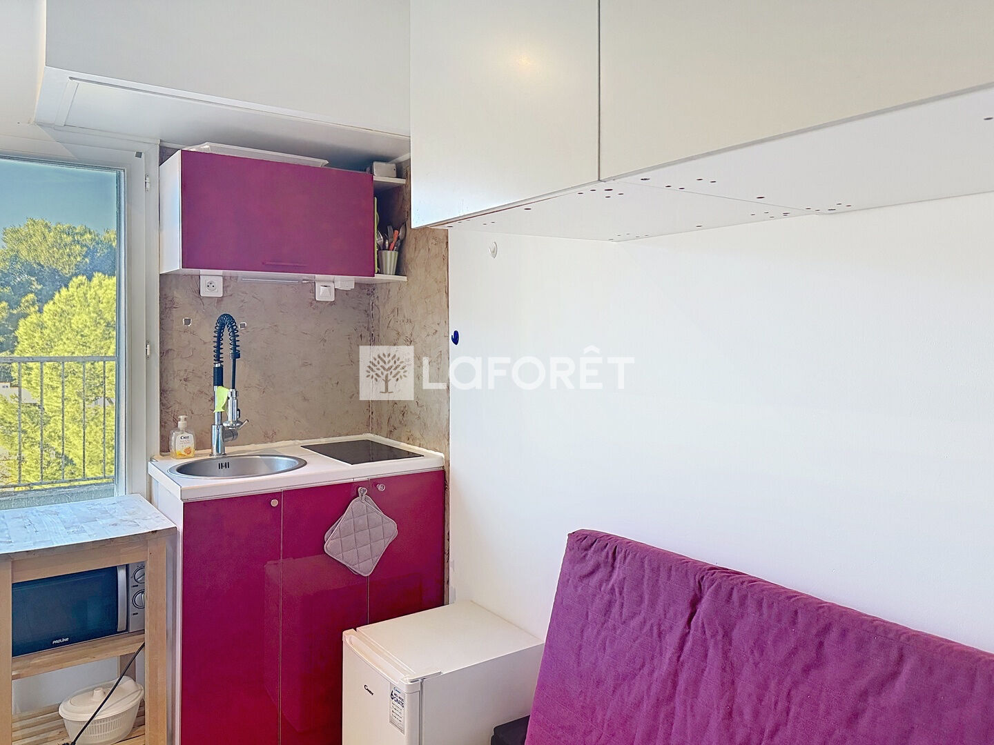 Idéalement agencé, le bien offre une pièce à vivre lumineuse avec canapé convertible, rangements intégrés, un coin bureau, une kitchenette fonctionnelle, ainsi qu'une salle d'eau avec WC.
