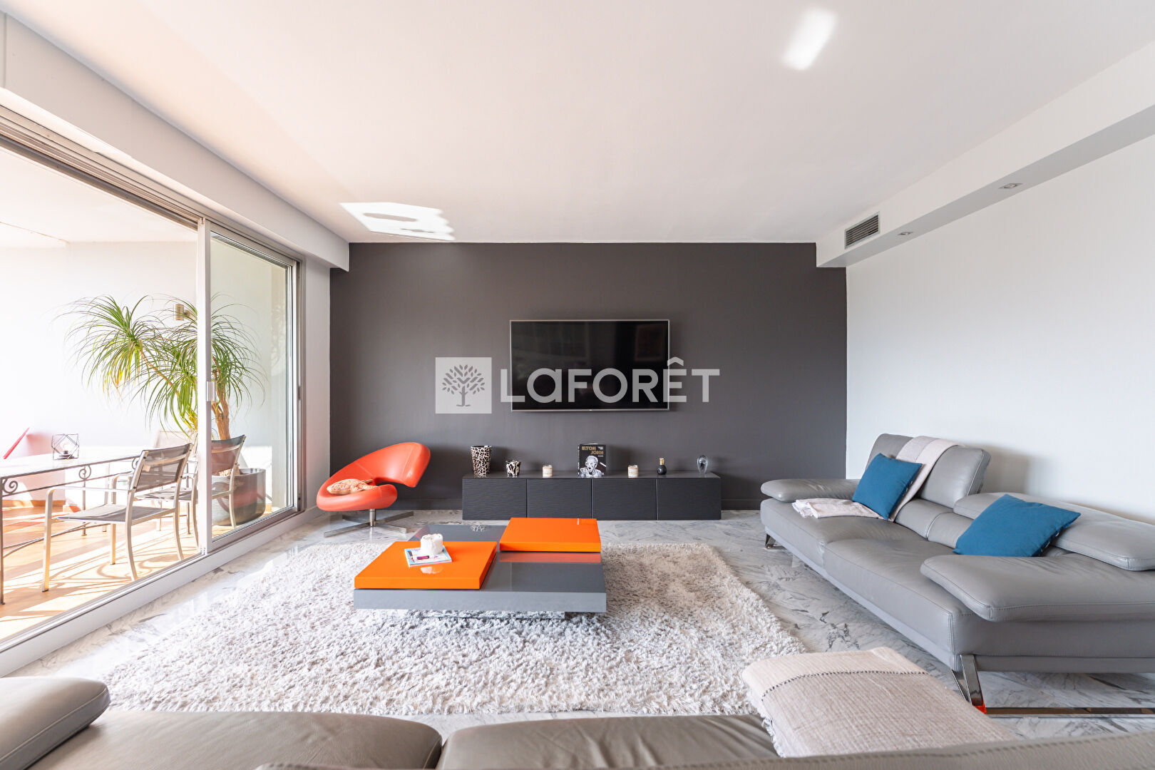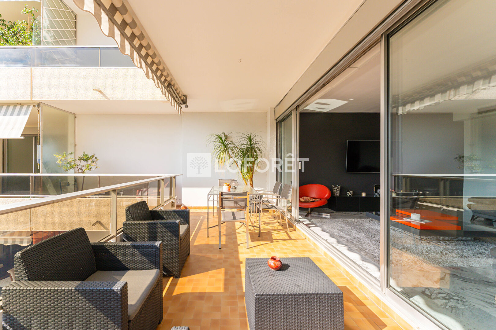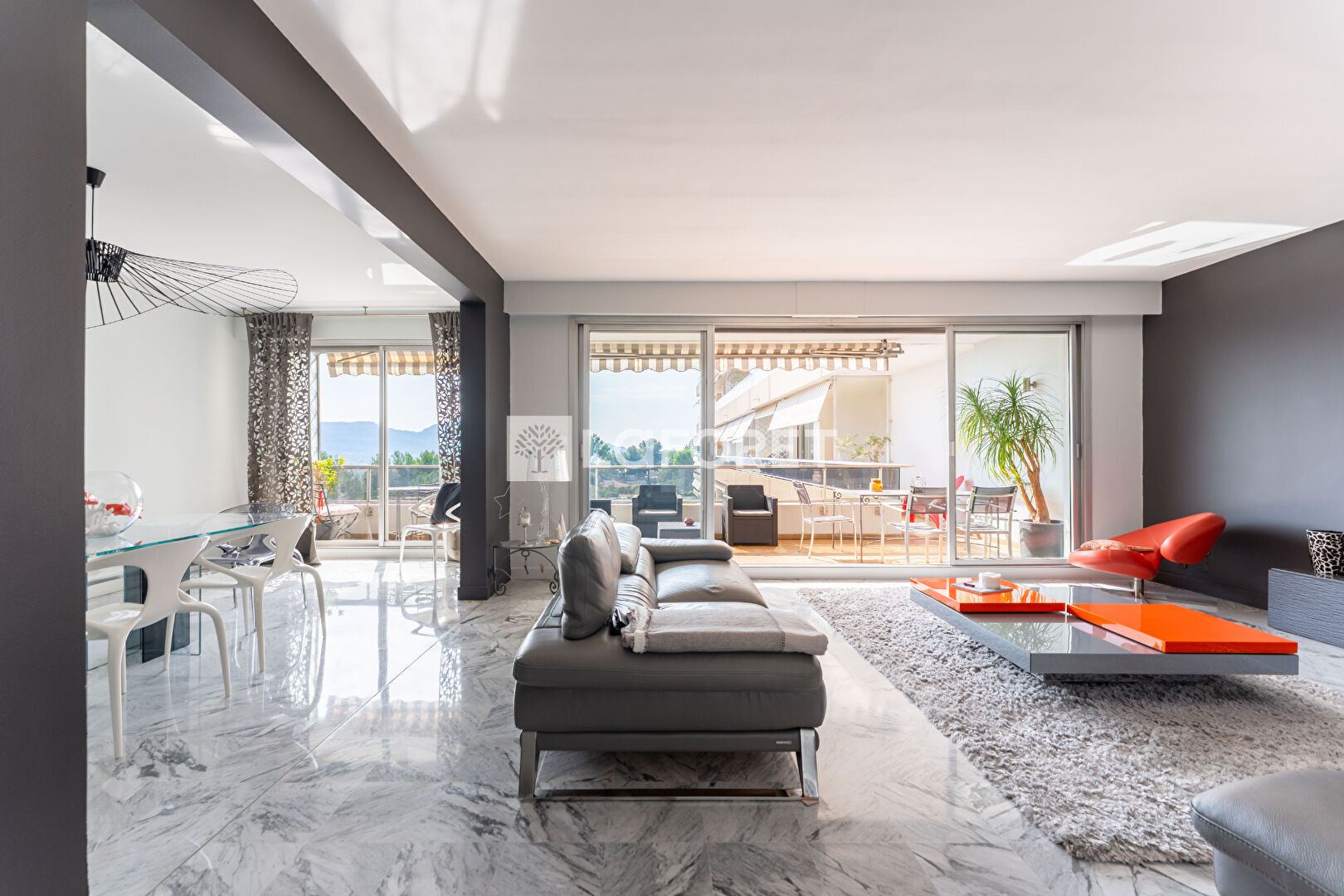 Il se compose d'un vaste séjour double ouvrant sur une spacieuse terrasse d'environ 20 m², avec une vue dégagée sur le parc arboré et la mer.