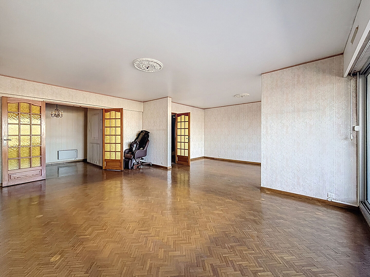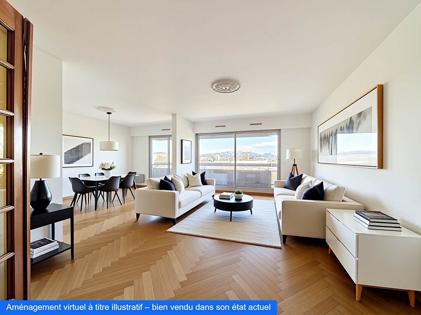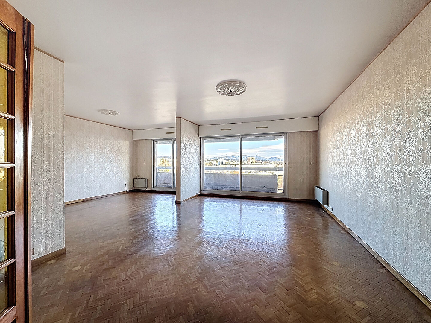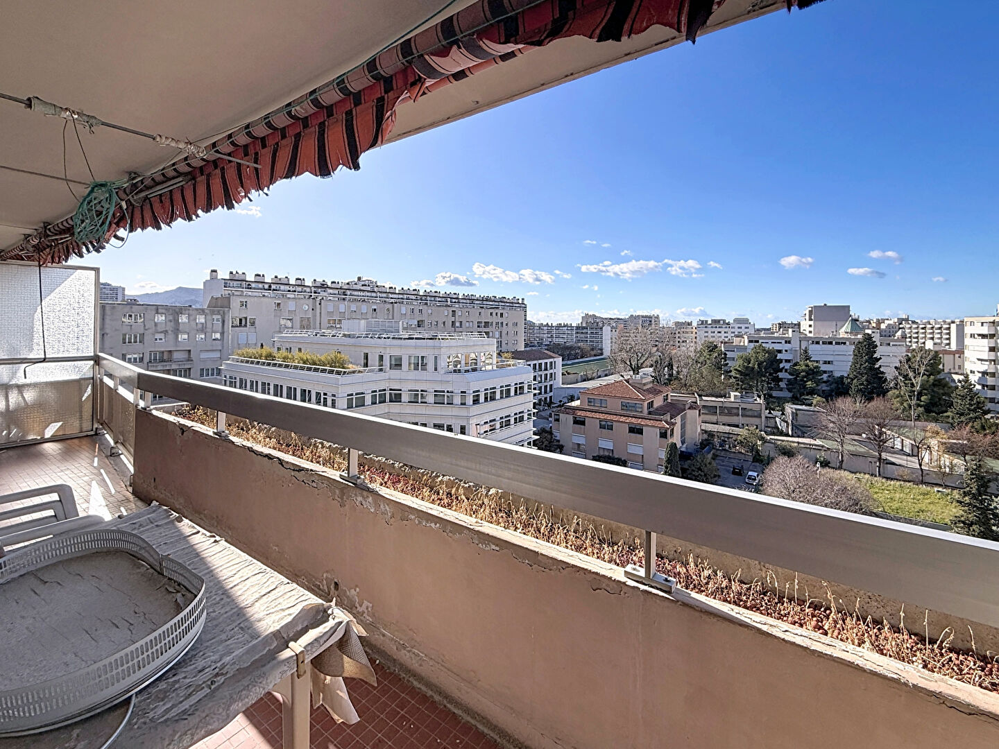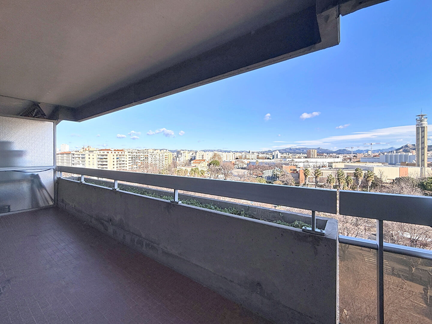 L'appartement se compose d'un double séjour donnant sur balcon de 8m² avec belle vue sur le stade Vélodrome (et collines) ; une grande cuisine séparée et 2 chambres donnant sur un autre balcon, une salle de bains, une salle d'eau, un wc séparé, et placard.