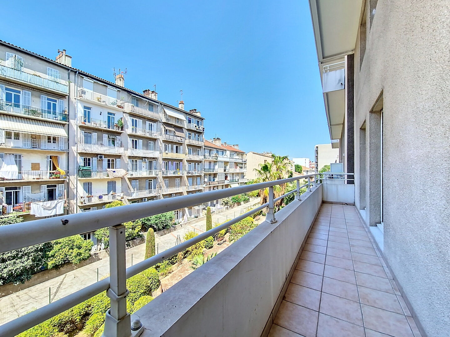 Cet appartement se compose d'une entrée avec placard, d'un vaste salon donnant sur une belle terrasse, d'une cuisine séparée à rafraichir donnant sur un grand balcon, de deux chambres avec placards donnant également sur balcon, un wc séparé ainsi qu'une salle de bains.