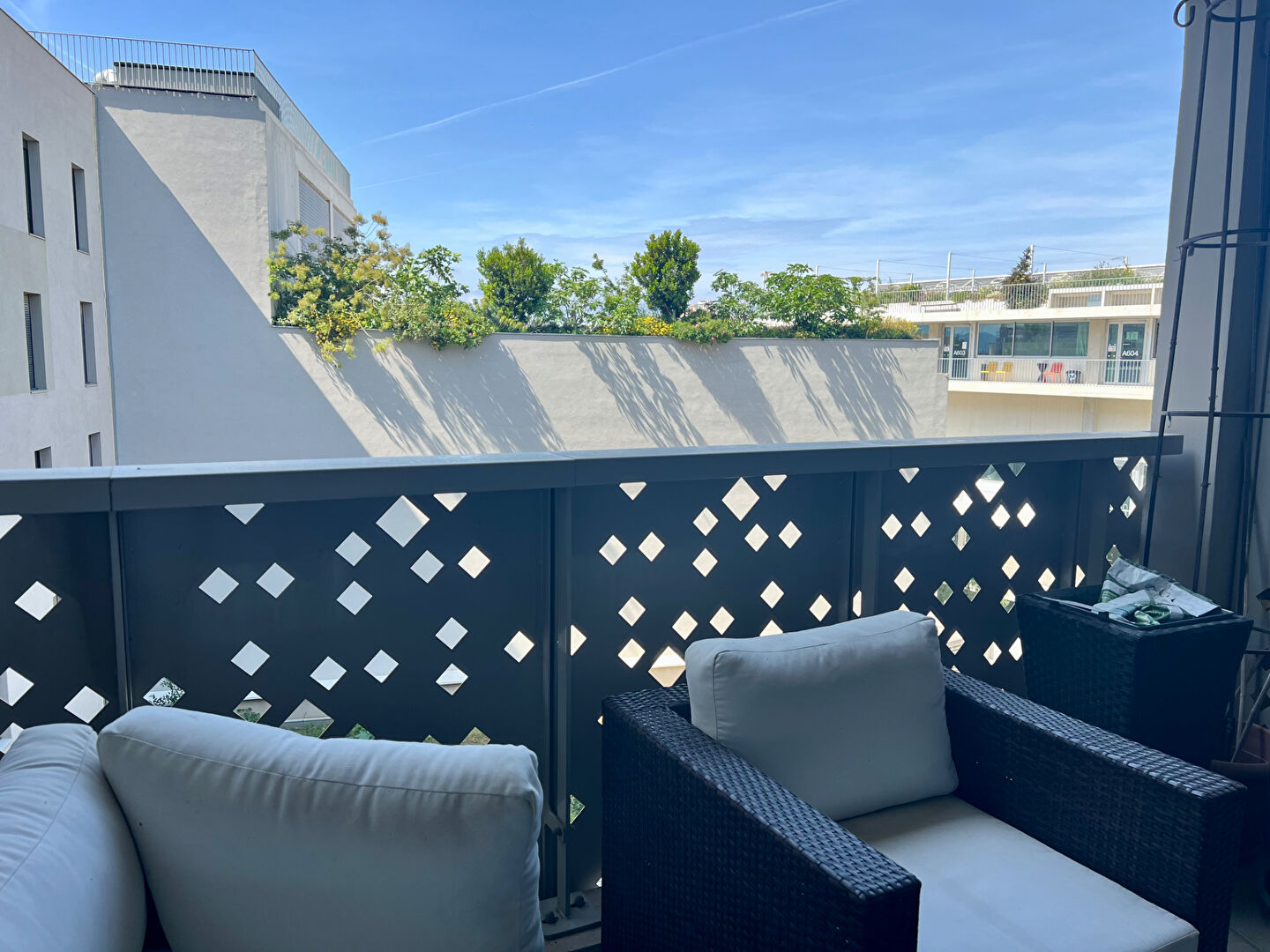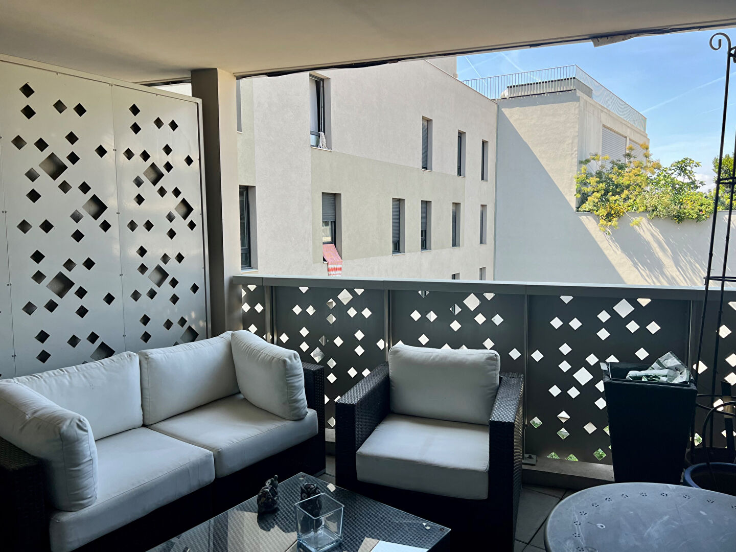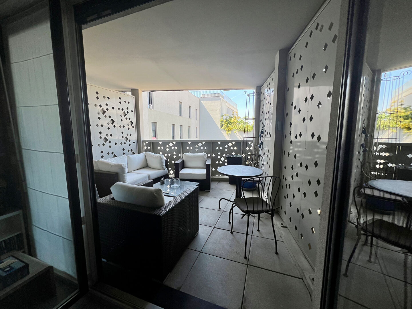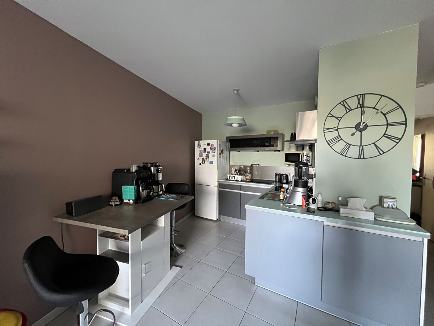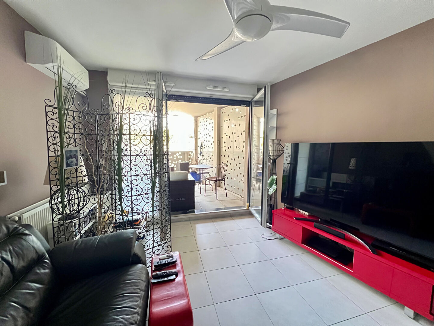 Un grand séjour de 25 m2 environ avec une cuisine ouverte donnant sur une agréable terrasse de 10 m2 exposée SUD- OUEST sans vis-à-vis. L'espace séjour est équipé d'une climatisation réversible.
