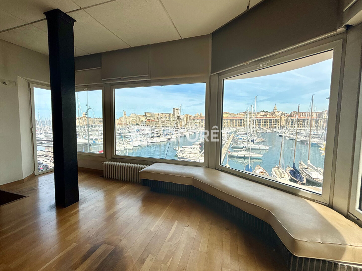 Un vaste espace principal d'environ 50 m², idéal pour une salle de réunion, un open--space ou un espace d'accueil premium, avec vue panoramique sur le port,