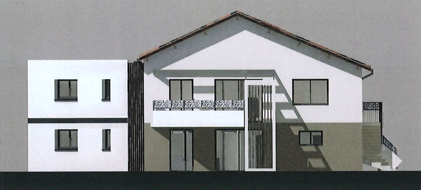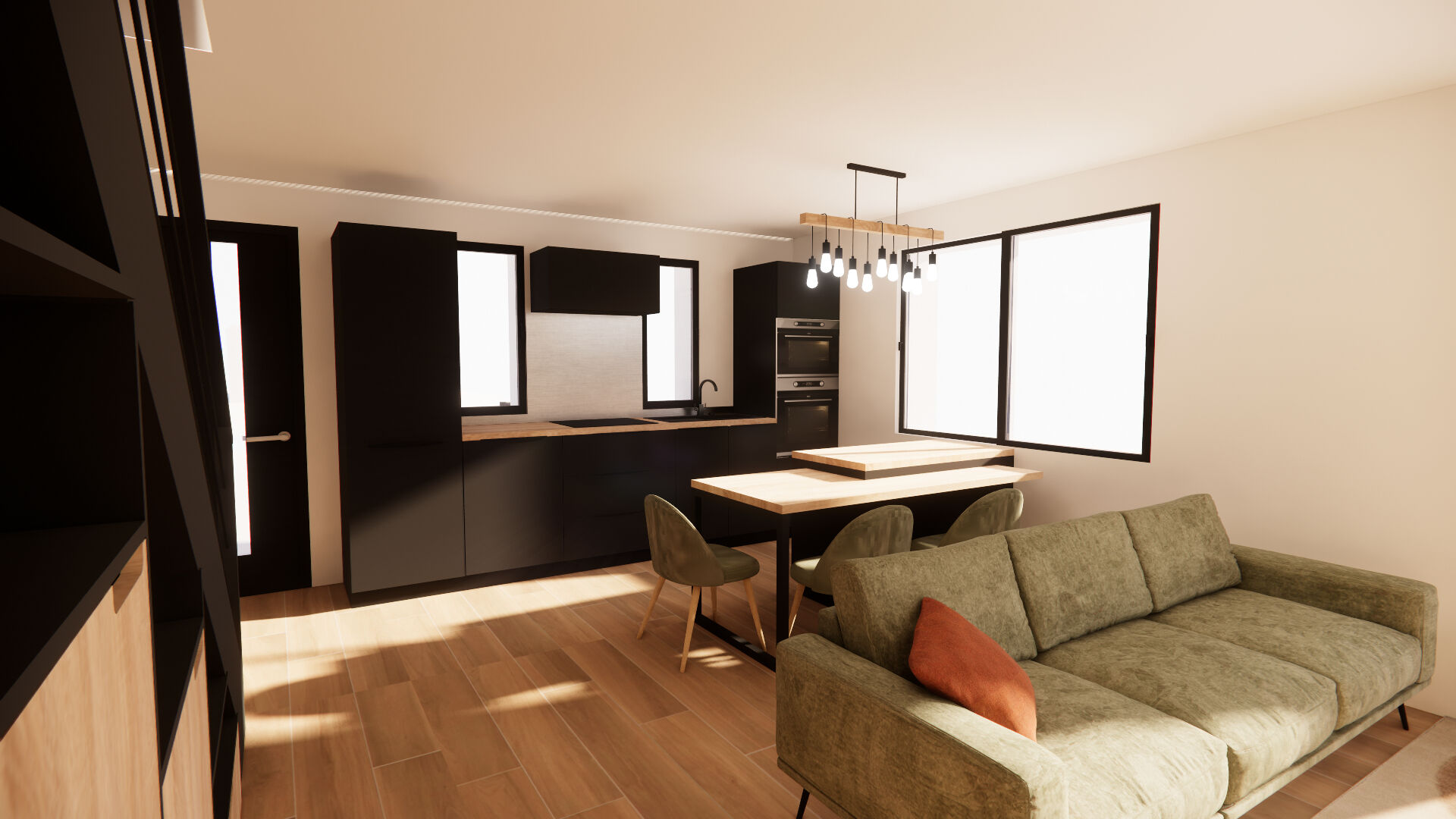 Espace de vie avec cuisine ouverte donnant sur jardin, cellier, 2 chambres avec pour chacune sa salle d'eau, wc.