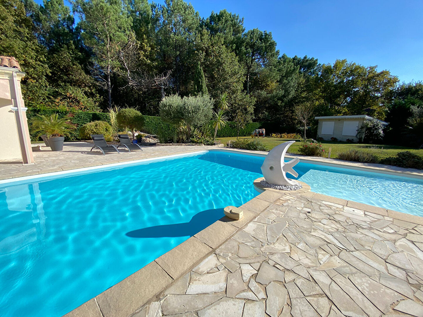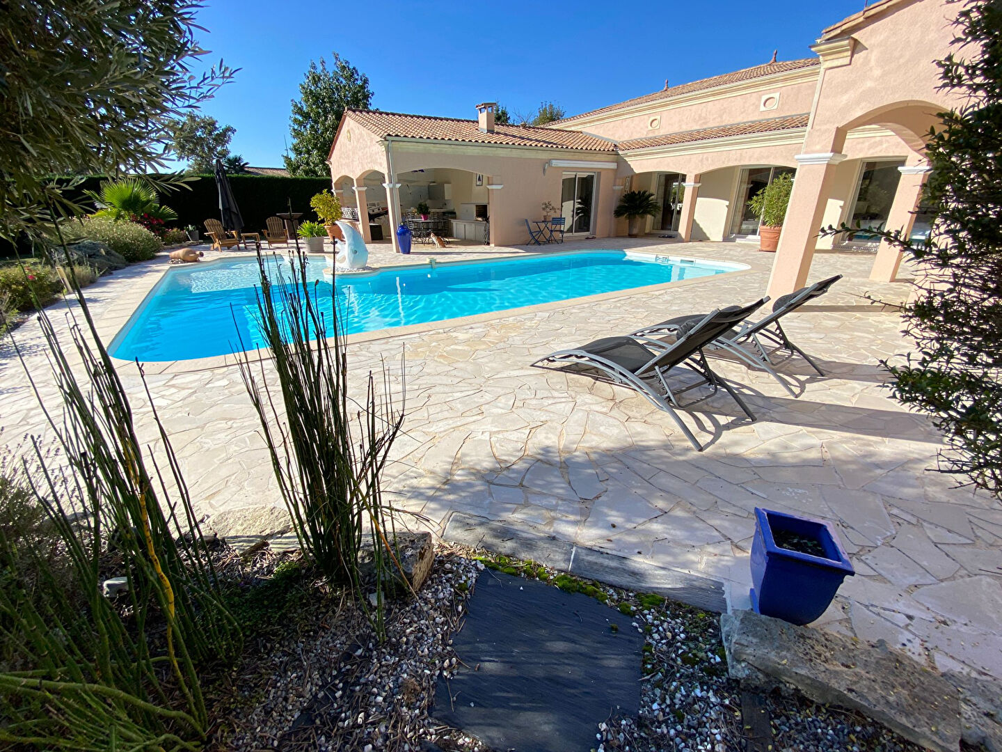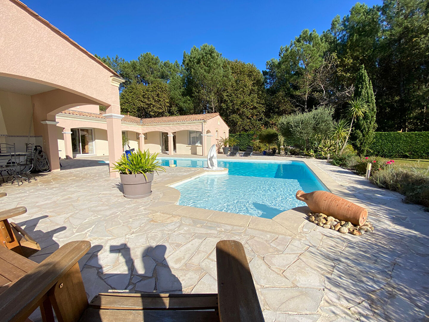 De nombreux espaces extérieurs avec Pool House aménagé pour des instants de détente ou de réception, double garage indépendant avec vaste capacité de rangement.