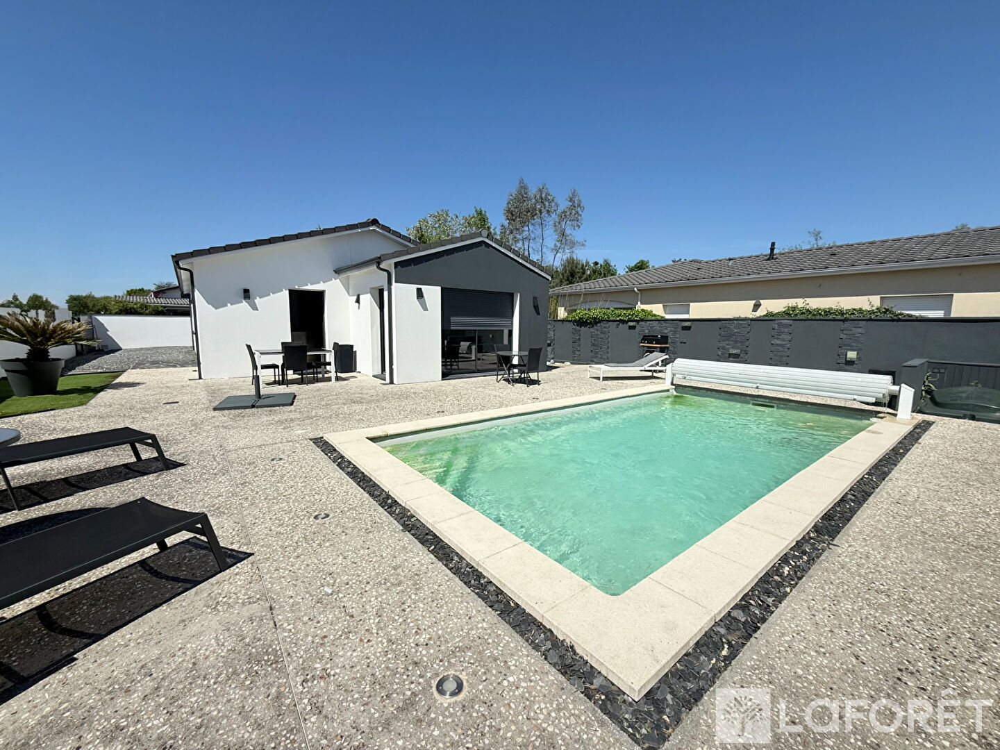 À l'extérieur, profitez d'un terrain parfaitement entretenu, avec une agréable terrasse idéale pour vos repas en plein air ainsi qu'une piscine orientée Sud-Ouest pour vos moments de détente ou d'amusement. Vous disposerez également d'un garage carrelé attenant offrant ainsi de nombreuses possibilités de rangement et de stationnement.