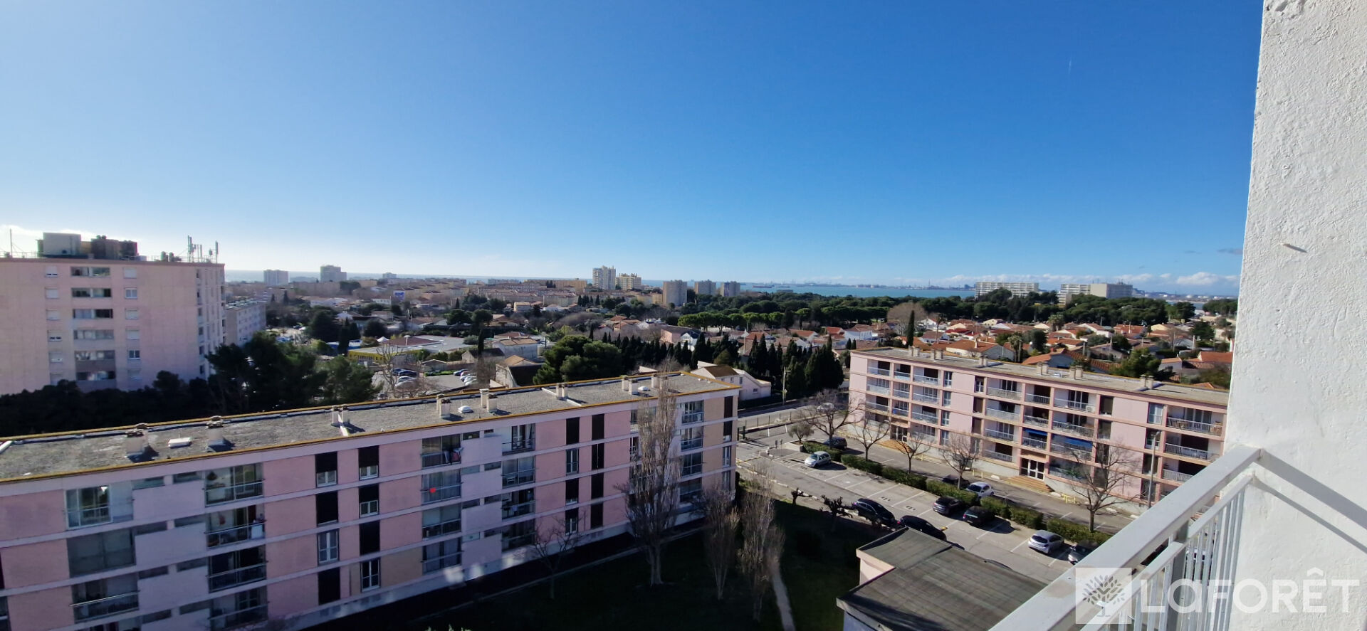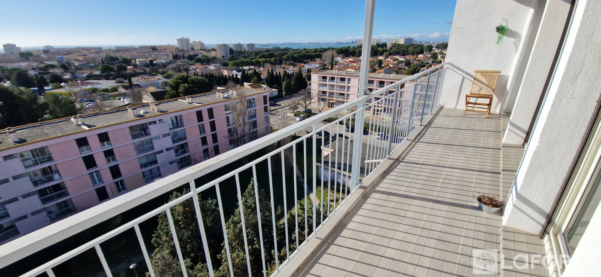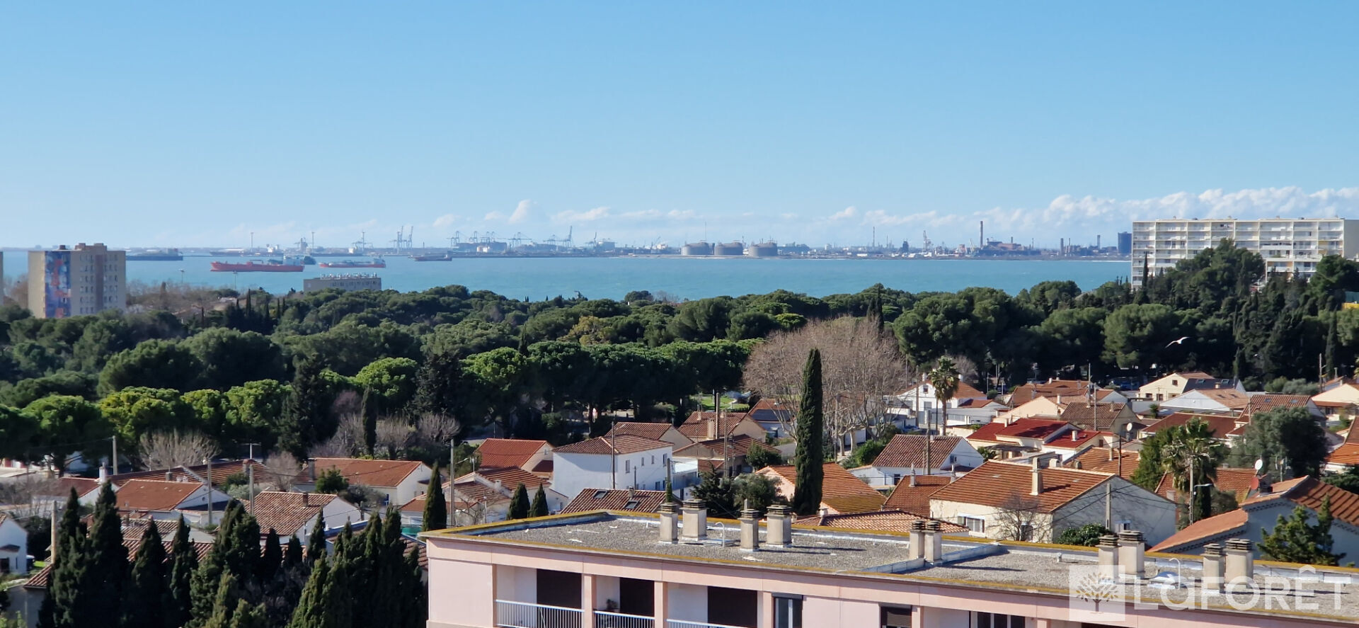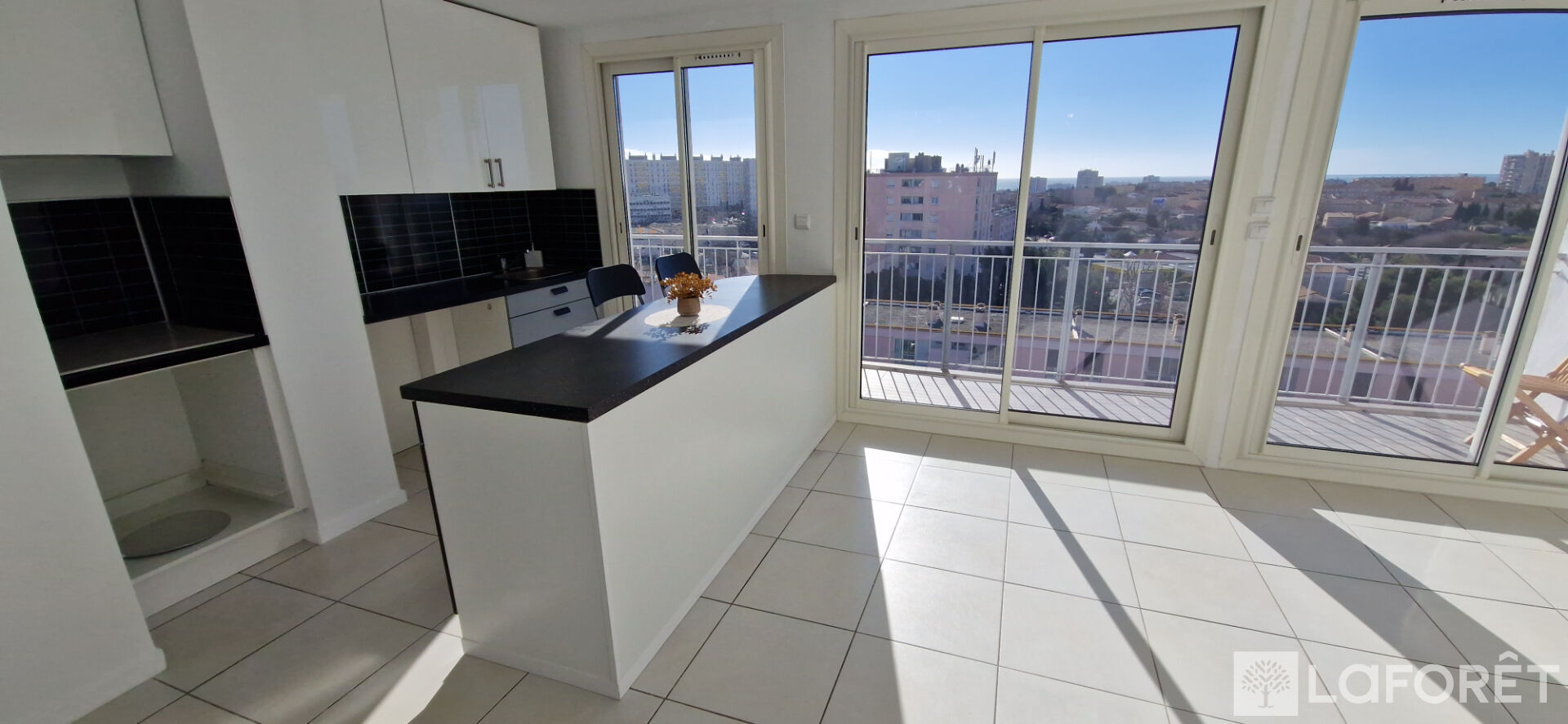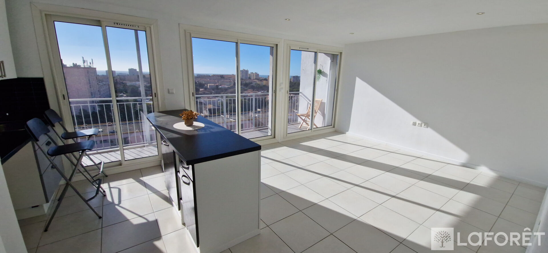Séjour / cuisine ouverte aménagée avec vue mer, 2 chambres, placards, salle d'eau et WC .