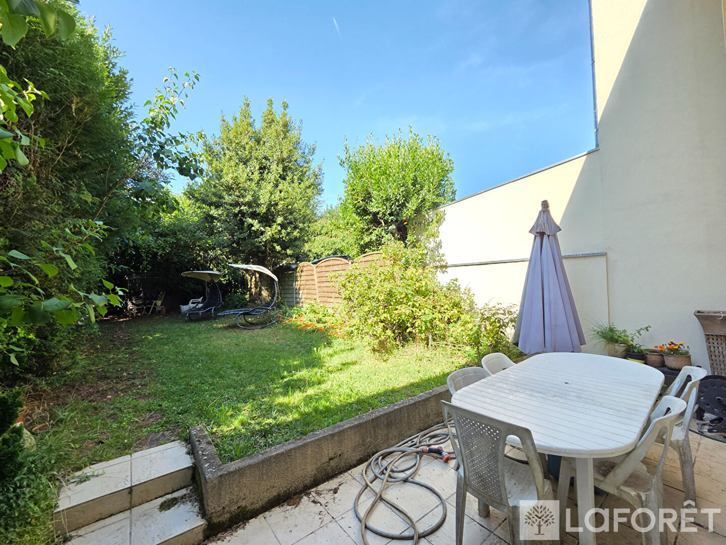 Un beau jardin arboré et au calme derrière la maison donne accès à un box privatif.