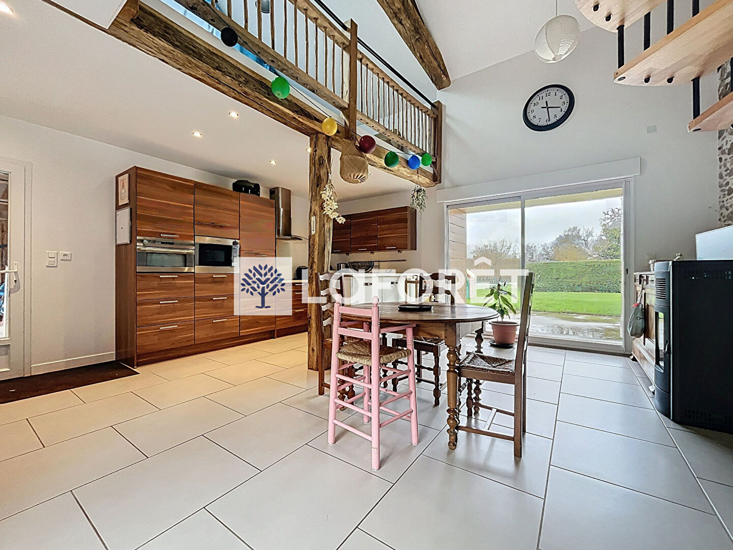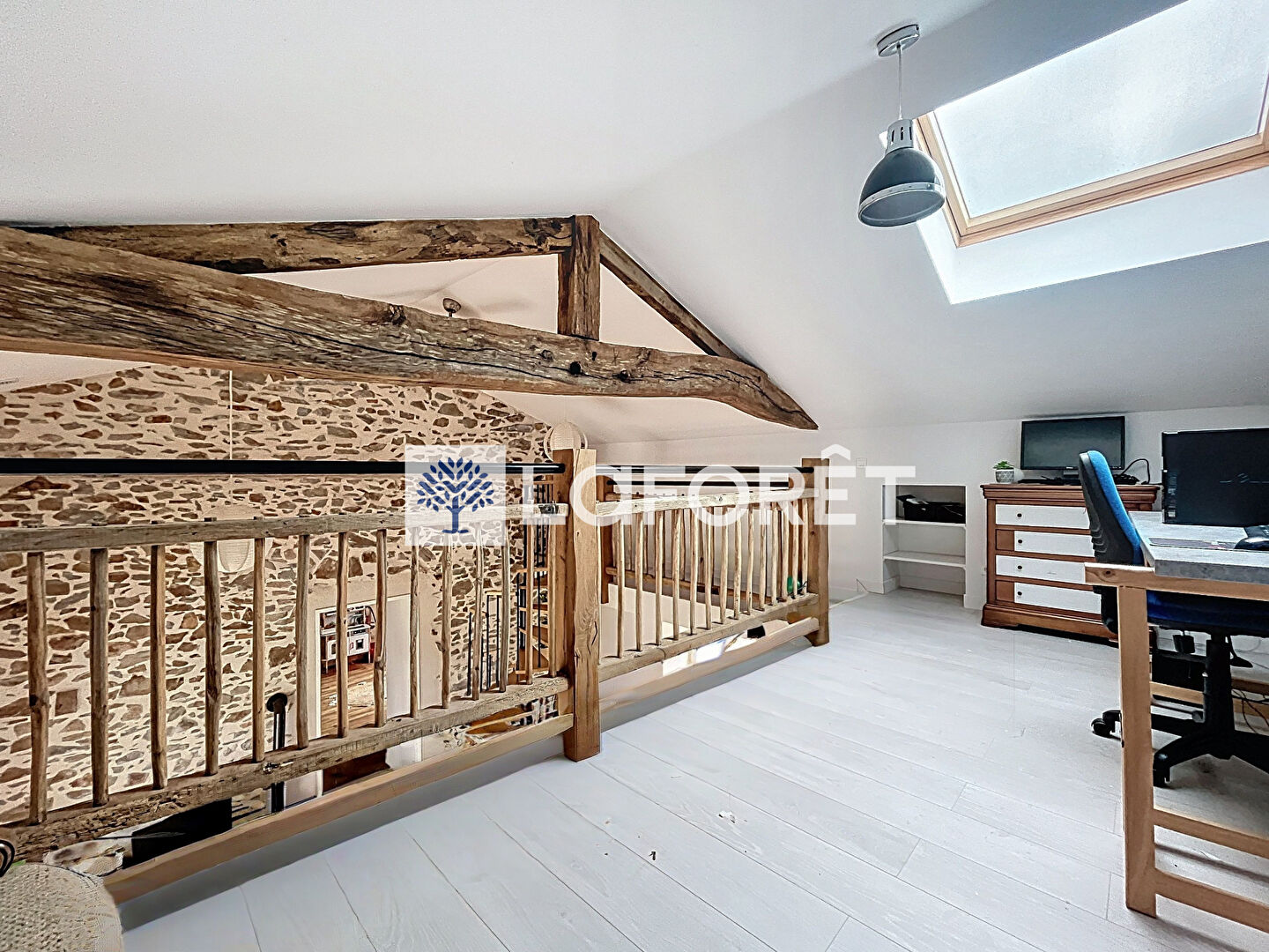 Au rez-de-chaussée : trois pièces de vie, dont un séjour sur parquet et un salon avec poêle à bois. Une cuisine équipée s'ouvre sur la terrasse par une large baie à galandage, avec un espace bureau en mezzanine.
