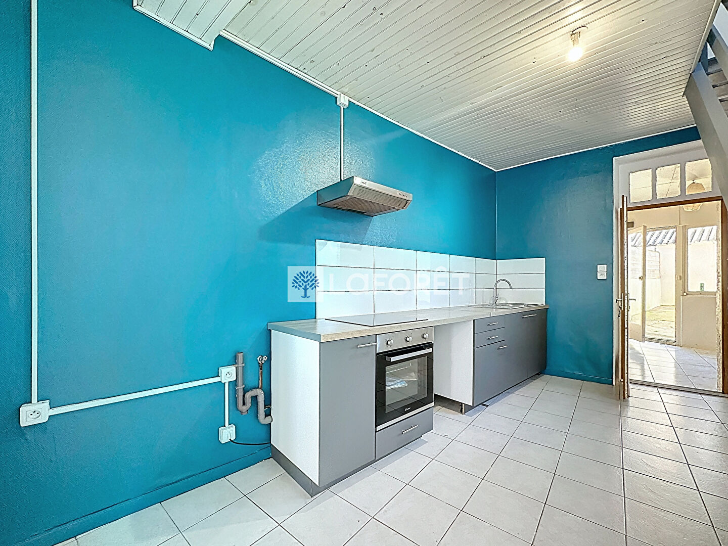 Maison de bourg de 69m2 située à La Pommeraie sur Sèvre, comprenant : Au rez-de-chaussé une pièce de vie avec espace cuisine aménagée et équipée (plaque, hotte et four), un cellier.