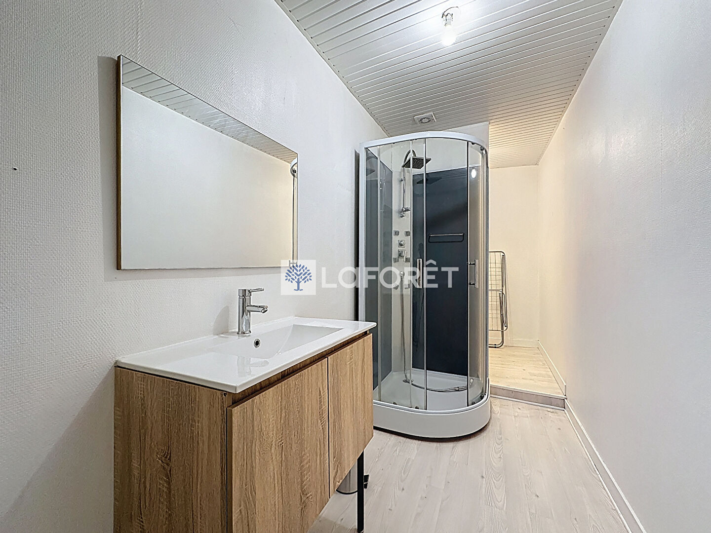 - A l'étage, une chambre et un bureau de 7,80m2 avec fenêtre et une salle d'eau avec vasque, douche et coin buanderie.