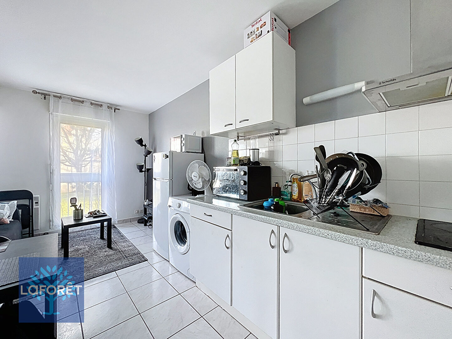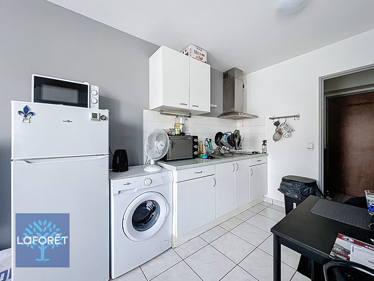 L'appartement se compose d'une belle pièce de vie avec cuisine aménagée et équipée, d'une salle d'eau avec WC, ainsi que de nombreux rangements dès l'entrée, offrant un espace fonctionnel et bien optimisé.
