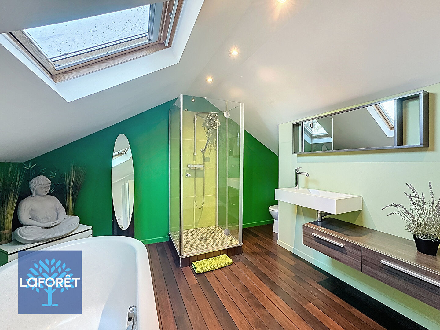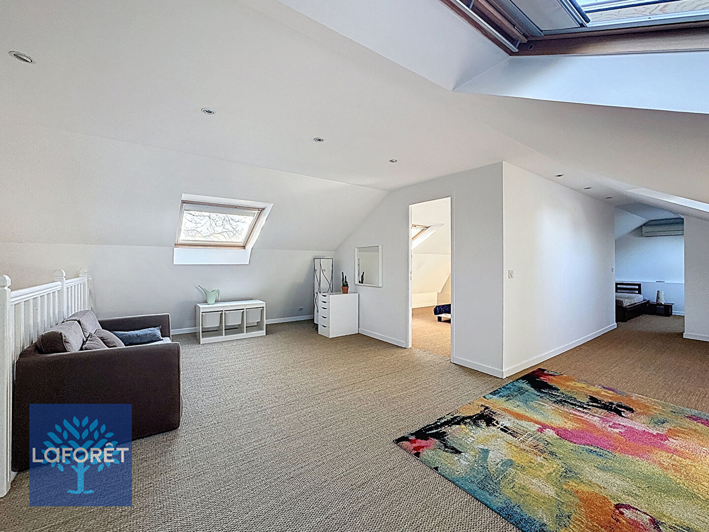 A l'étage, une vaste pièce palière donne accès à un coin nuit et une chambre, une salle de bains mixte avec WC et un rangement.