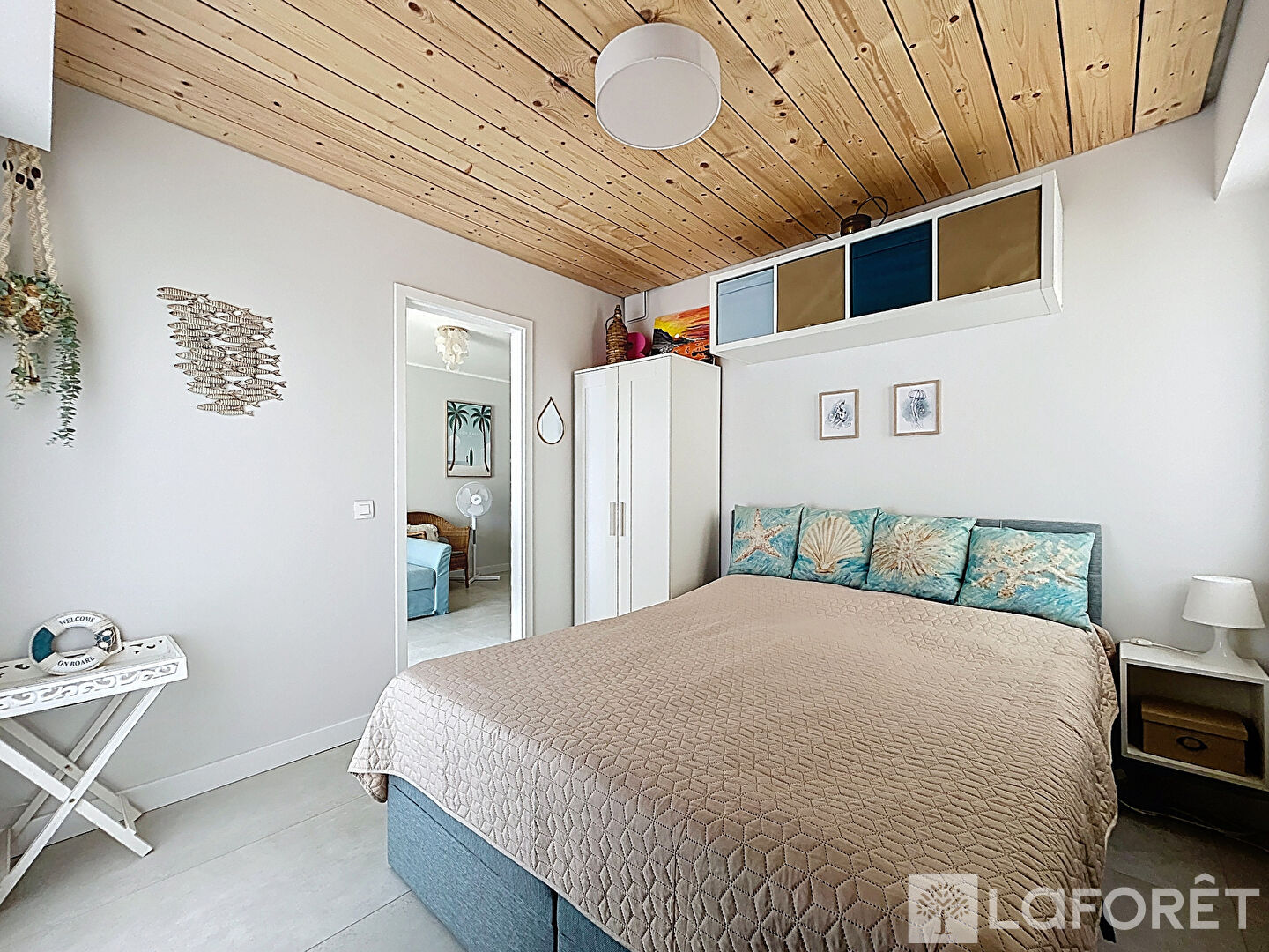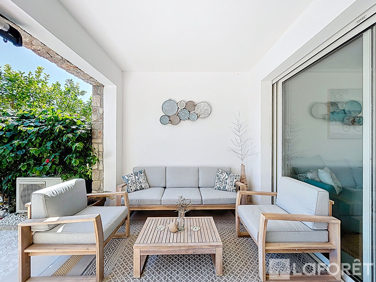 Il comprend : un hall d'entrée, une cuisine ouverte sur séjour, une chambre, une salle d'eau avec wc mais également une pièce suppplémentaire, offrant des possibilités selon besoin : bureau, chambre d'ami, grand dressing... Mais ce que nous apprécions encore plus, c'est son vaste espace extérieur de 52m², composé d'une terrasse couverte et d'un jardin surplombant la grande bleue.