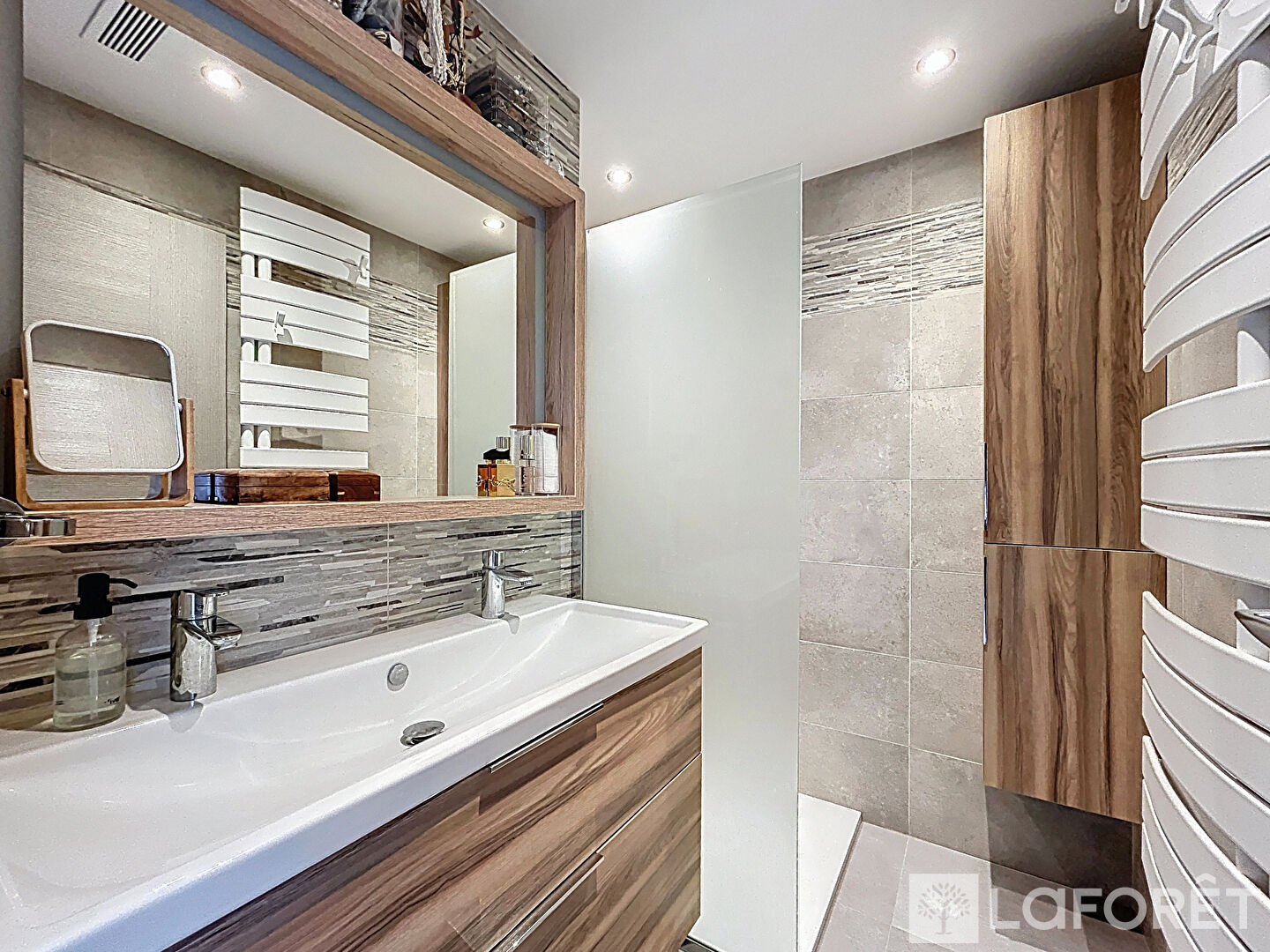 Les intérieurs dévoilent une atmosphère chaleureuse et contemporaine, où se mêlent peintures blanches, carrelage gris effet ciment et touches de bois, pour une élégance sobre et intemporelle. On apprécie également son agencement réfléchi et optimisé par de nombreux rangements : deux chambres (10m² en), séjour (22m²), couloir et hall d'entrée avec placard?