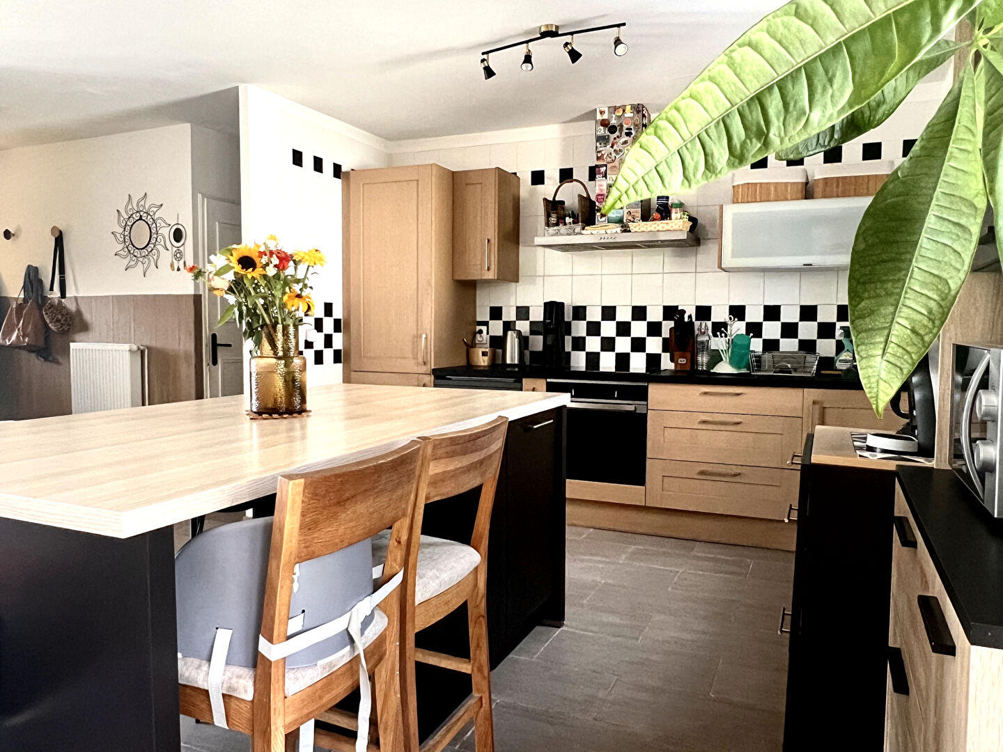 Un salon-séjour traversant ouvert sur une cuisine moderne et entièrement équipée, avec îlot central,