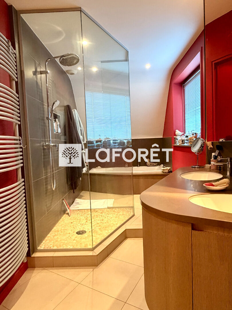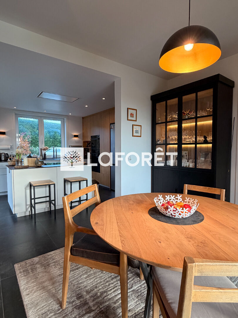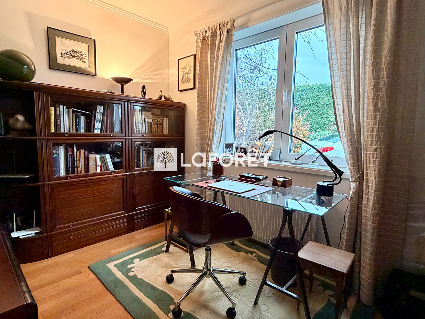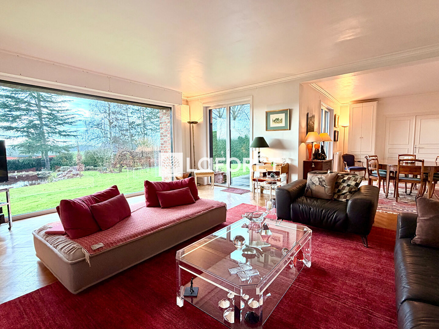 Au rez-de-chaussée, belle entrée cathédrale, living de 50 m², baigné de lumière, avec cheminée feu de bois, parquet chêne et grandes baies vitrées.