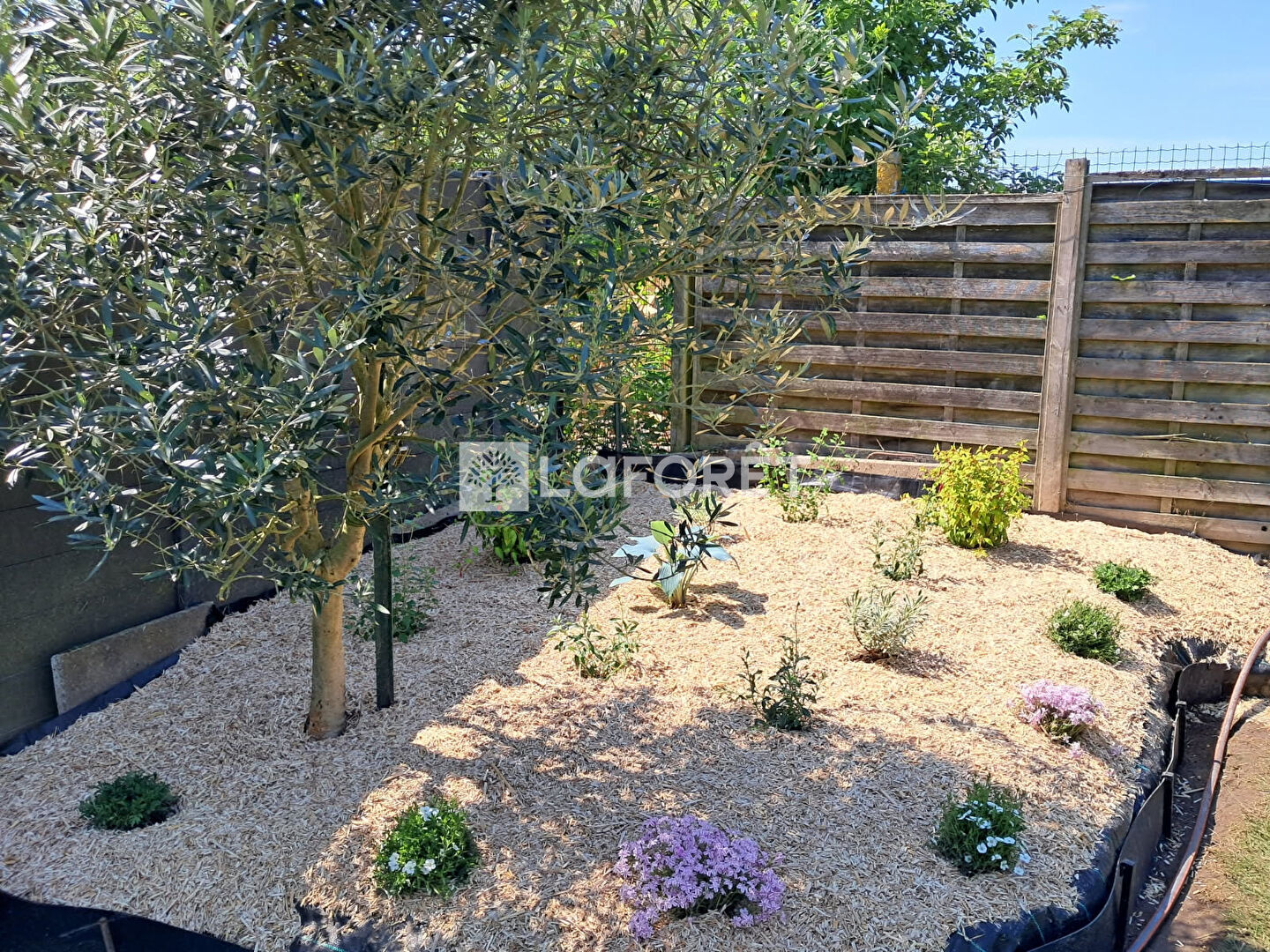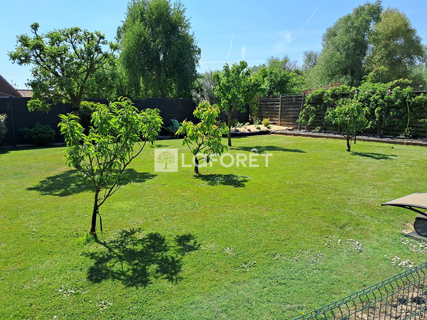 À l'extérieur, la pergola s'ouvre sur un jardin exposé Sud/Ouest, soigneusement entretenu, où chaque fin de journée se transforme en parenthèse de tranquillité.