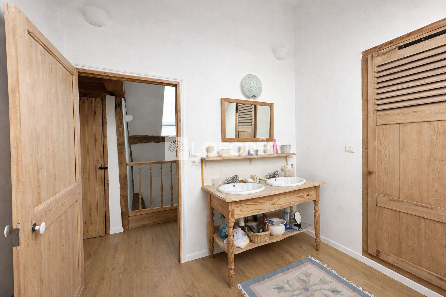 Retournez dans la pièce de vie et empruntez le magnifique escalier pour vous rendre à l'étage et rejoindre la suite parentale, avec poutres apparentes, et la salle de bains avec baignoire, douche et double vasque.