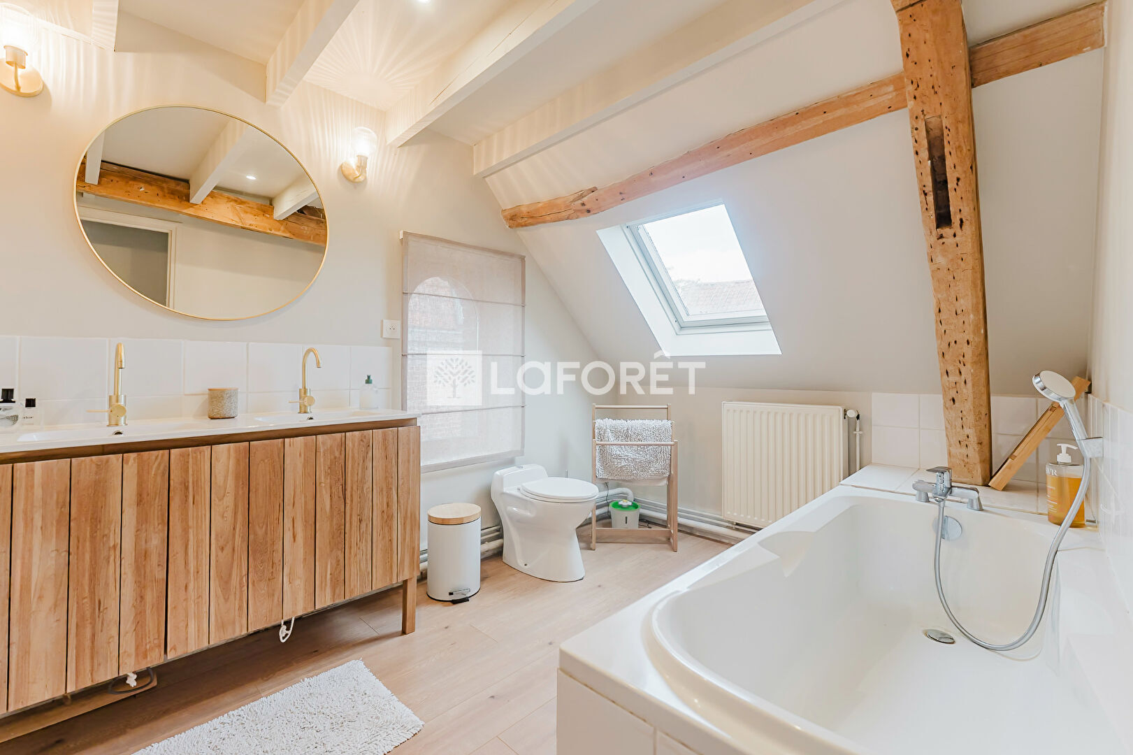 A l'étage, un espace bureau/salon très cosy grâce à ses poutres apparentes et son parquet, trois chambres ainsi qu'une magnifique salle de bain.