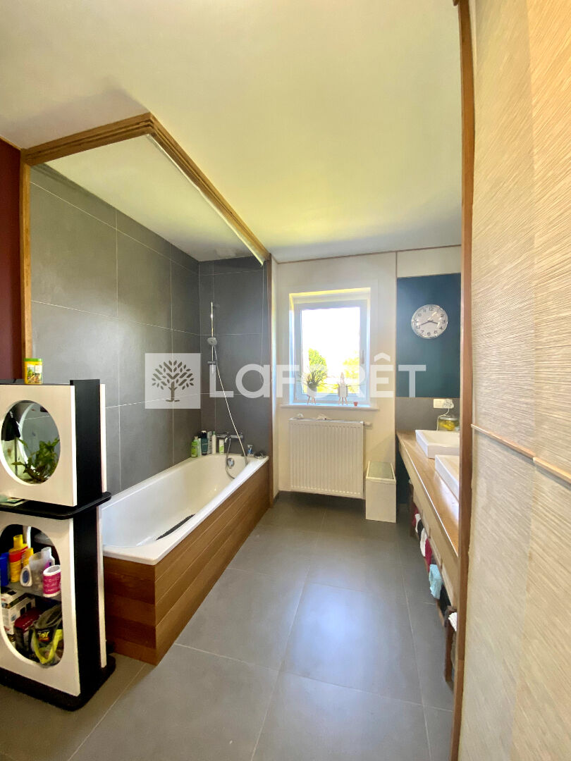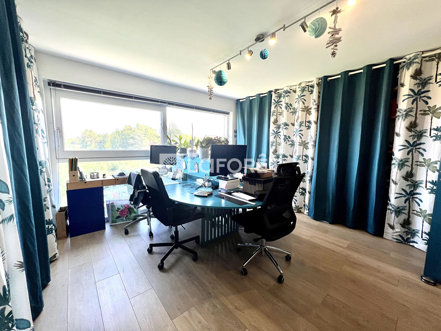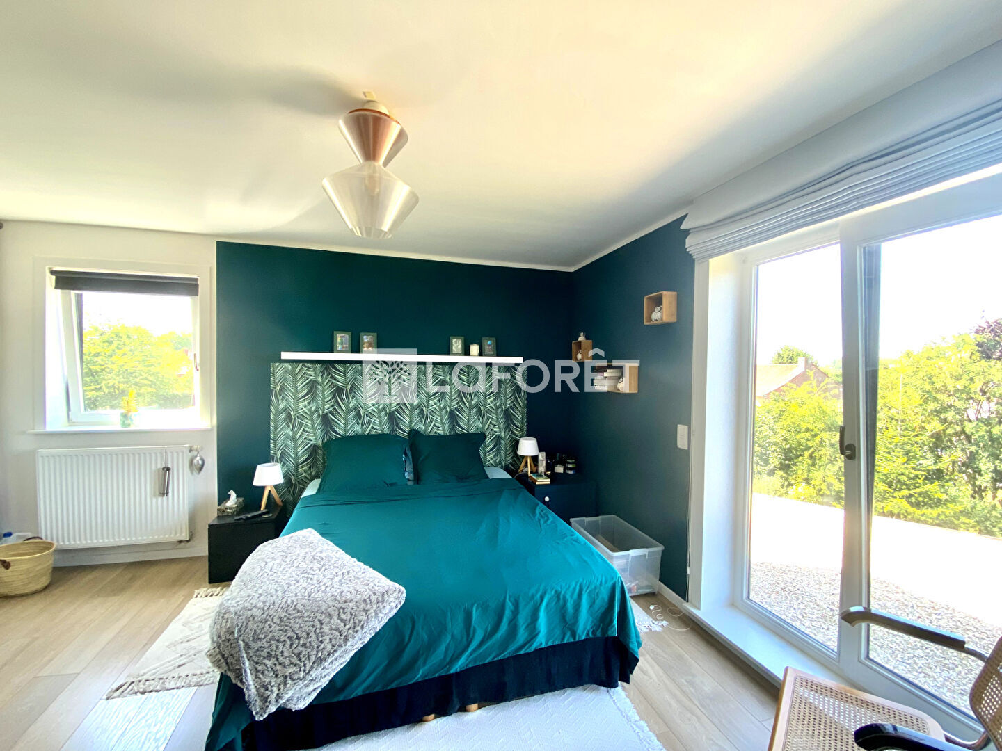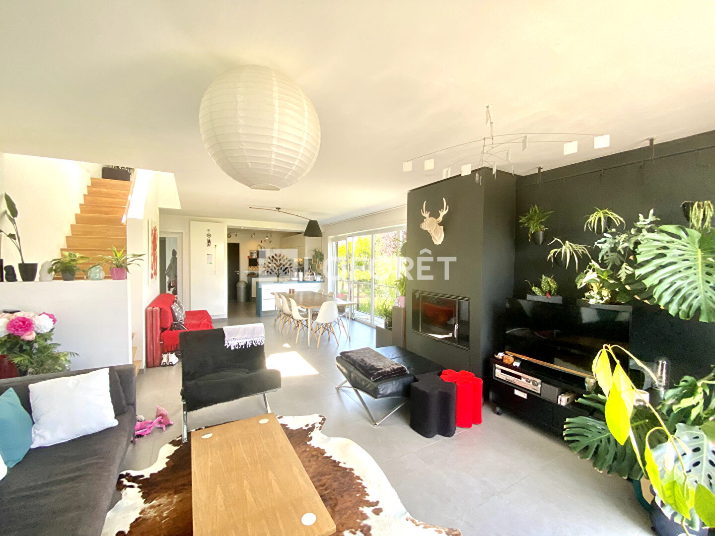 La cuisine équipée est ouverte sur la pièce à vivre avec cheminée. Les larges baies coulissantes offrent une vue panoramique sur la verdure environnante et la terrasse. À l'étage, le plateau intègre trois chambres dont une suite parentale , une salle de bains et des toilettes. Un grand bureau de plus de 20 m2 vous comblera également pour le télétravail. La particularité de ce niveau est son puit de lumière dans le lounge qui inonde l'intérieur d'une agréable lumière zénithale.