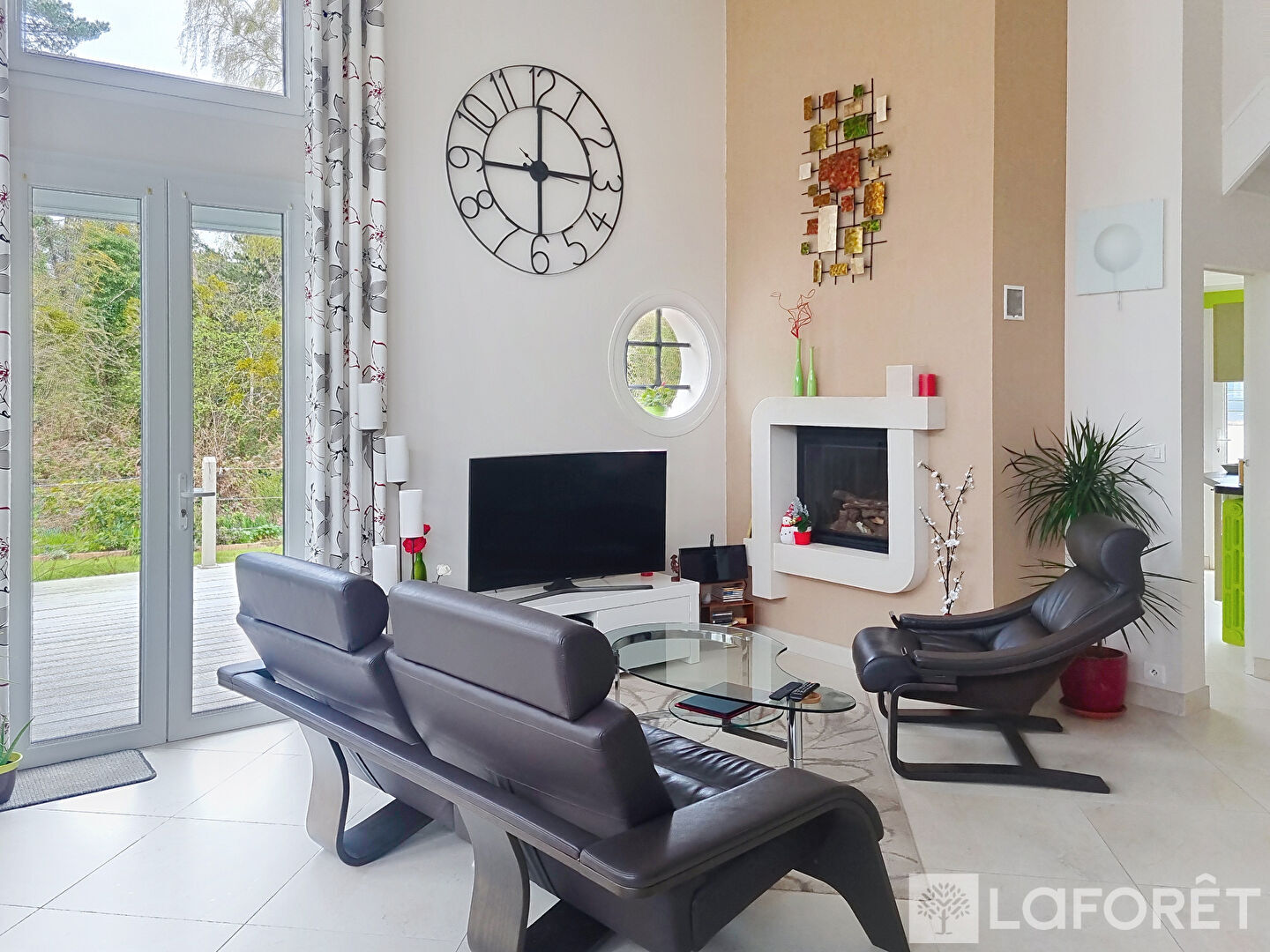 Un très beau séjour cathédrale, inondé de lumière et offrant une belle cheminée, accède directement sur la terrasse exposée sud-ouest. La cuisine entièrement équipée et aménagée donne également sur la terrasse et le jardin.