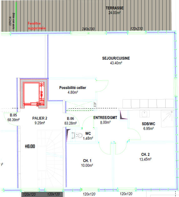 Cet appartement T3 fait 82.28m² et possède une terrasse de 24m².