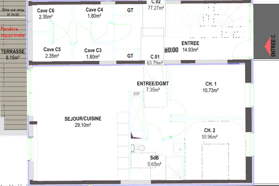 Cet appartement T3 fait 63,79m² et possède une terrasse de 8,15m².